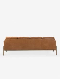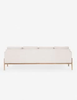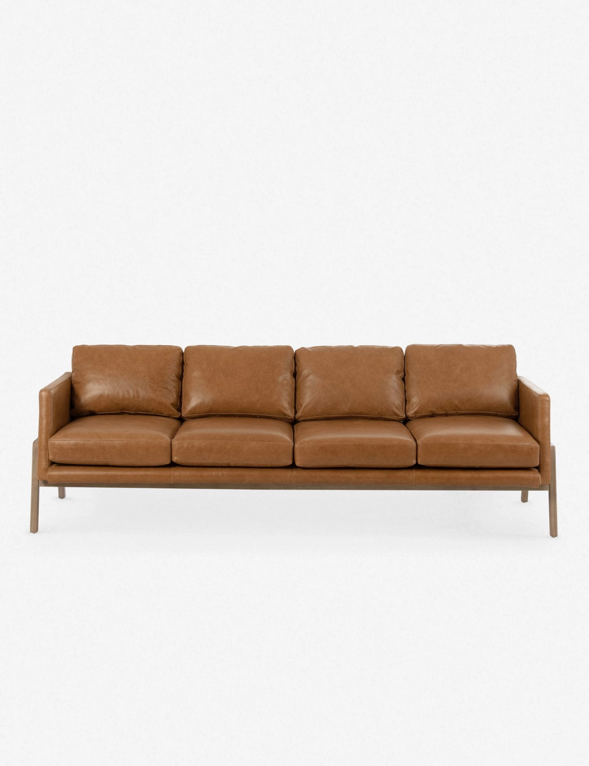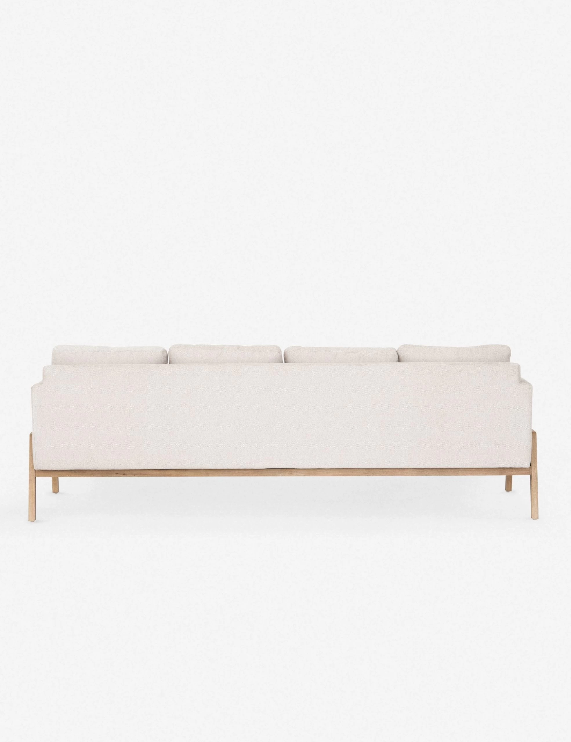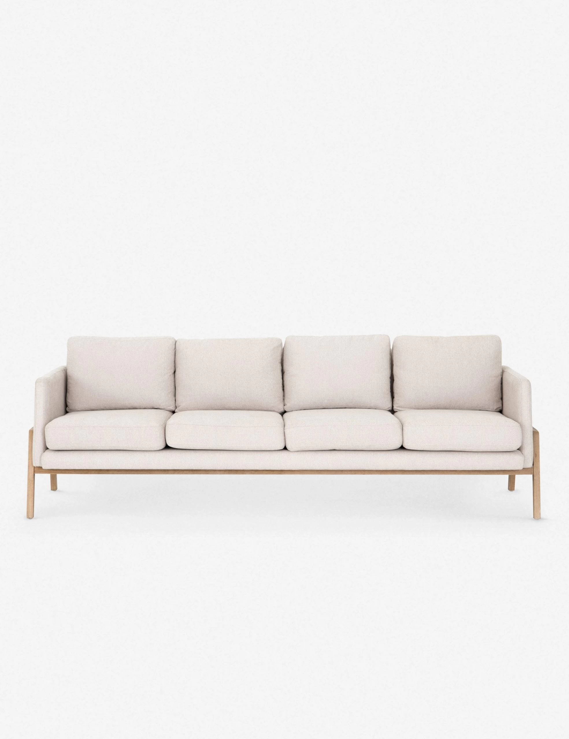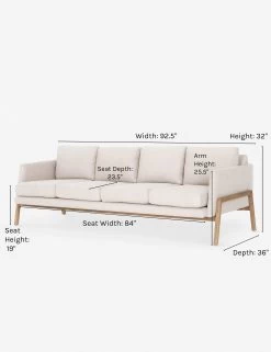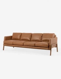 A timeless sofa with a contemporary twist. Complete with performance fabric cushions and an angled wooden frame, it features elements of both modern and traditional aesthetics for a versatile style statement.
