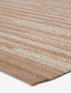 Striated desert neutral tones overlap in an offset stripe motif to create a tactile and colorful area rug. Handwoven from natural jute fibers, this rug can be styled in high-traffic areas like a kitchen, hallway, or living space.