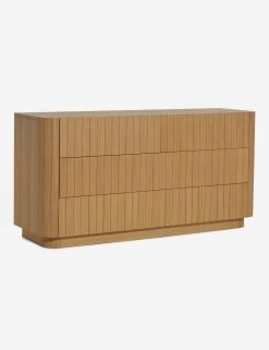 Our Bane dresser offers a modern look rooted in the natural elegance of rich wood grain. Wood cladding creates architectural appeal while rounded corners soften the silhouette for understated impact in the room. With six soft-close drawers, this dresser is a tone-setter for a grounded bedroom design.