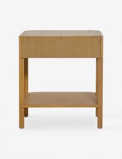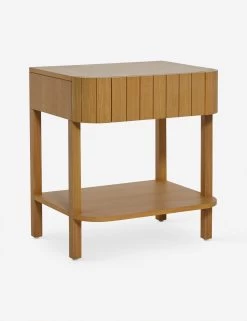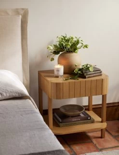 Our Bane nightstand offers a modern look rooted in natural elegance of rich wood grain. Wood cladding creates architectural appeal while rounded corners soften the silhouette for understated impact in the room. This bedside table features a soft-close drawer and styles great in a pair for a symmetric bedroom look.