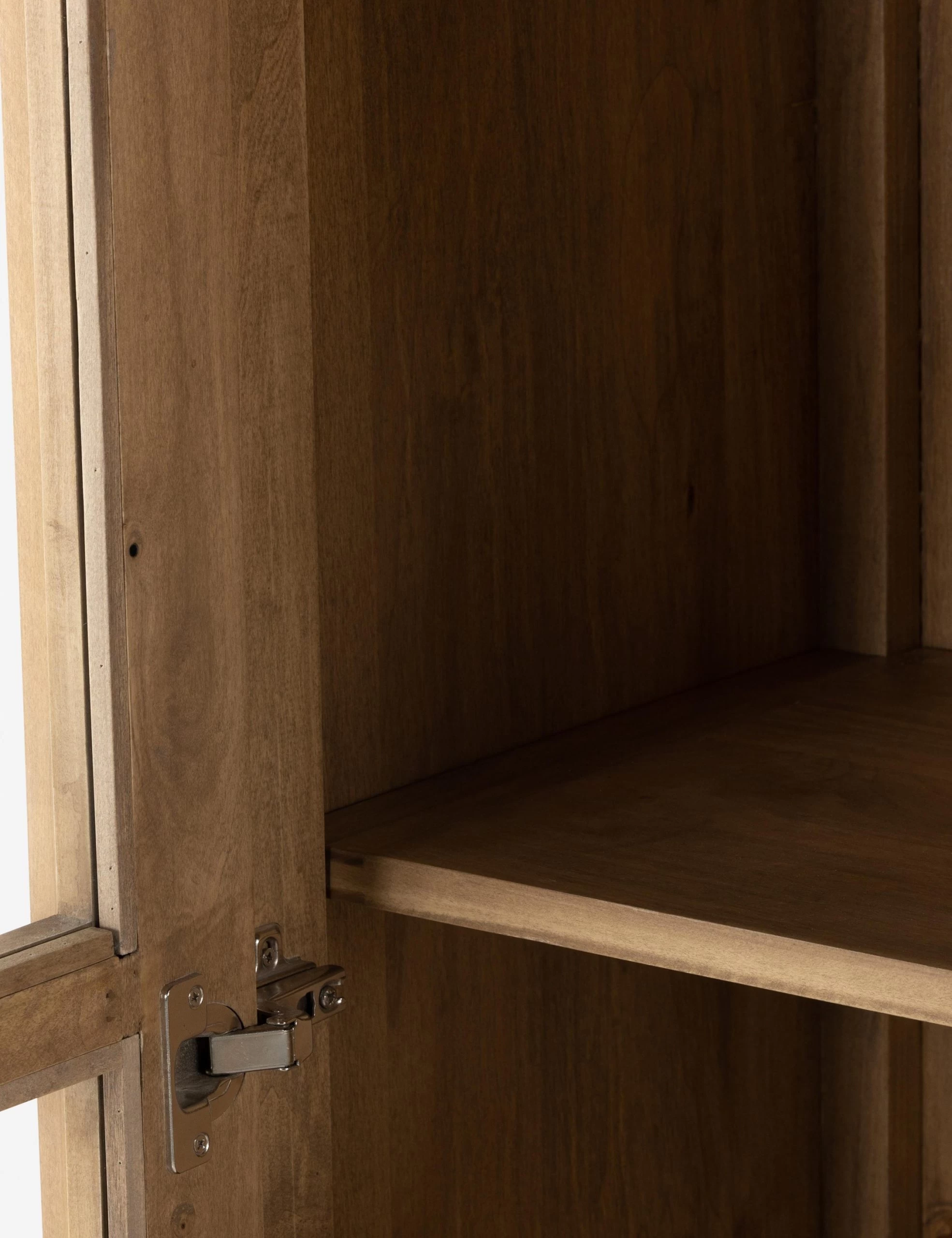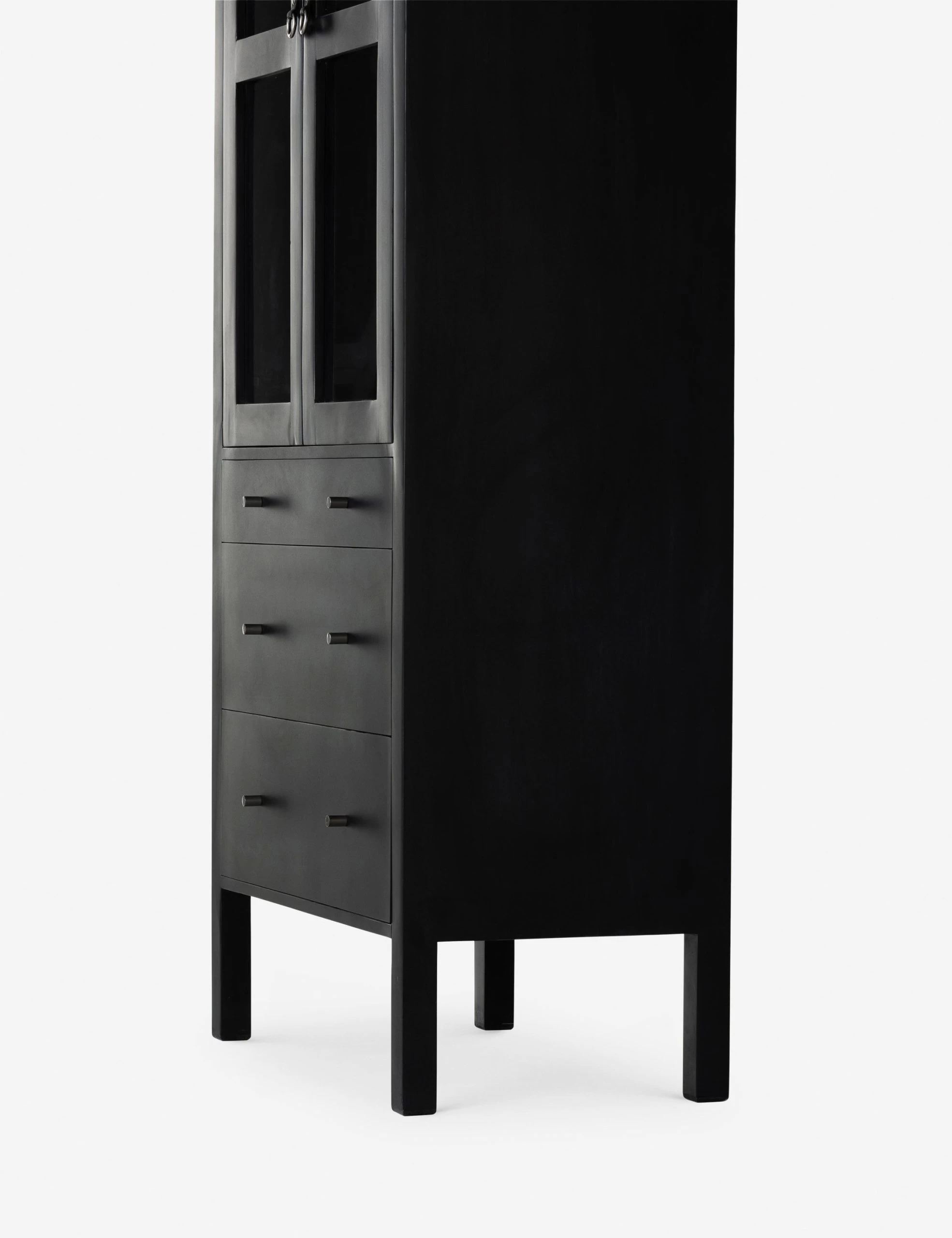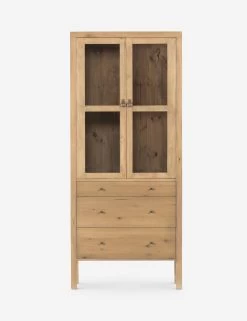 Pared-down lines and dovetail joints define this curio cabinet, bringing a simple, sophisticated look to your space. Crafted from solid poplar, it’s a fresh update to Shaker-inspired style. Glass-front doors and three spacious drawers with iron and leather pulls open to storage and display for everything from dinnerware and linens to books and more.