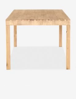 Pared-down lines and rough-hewn texture define this wood dining table, bringing a simple, sophisticated look to your space. Crafted from solid dry-washed poplar that forms a Parsons-style dining table with faux dovetail joinery, it’s a fresh update to Shaker-inspired style. Layer on natural linens and ceramic tableware in lighter neutrals and soft pastels.