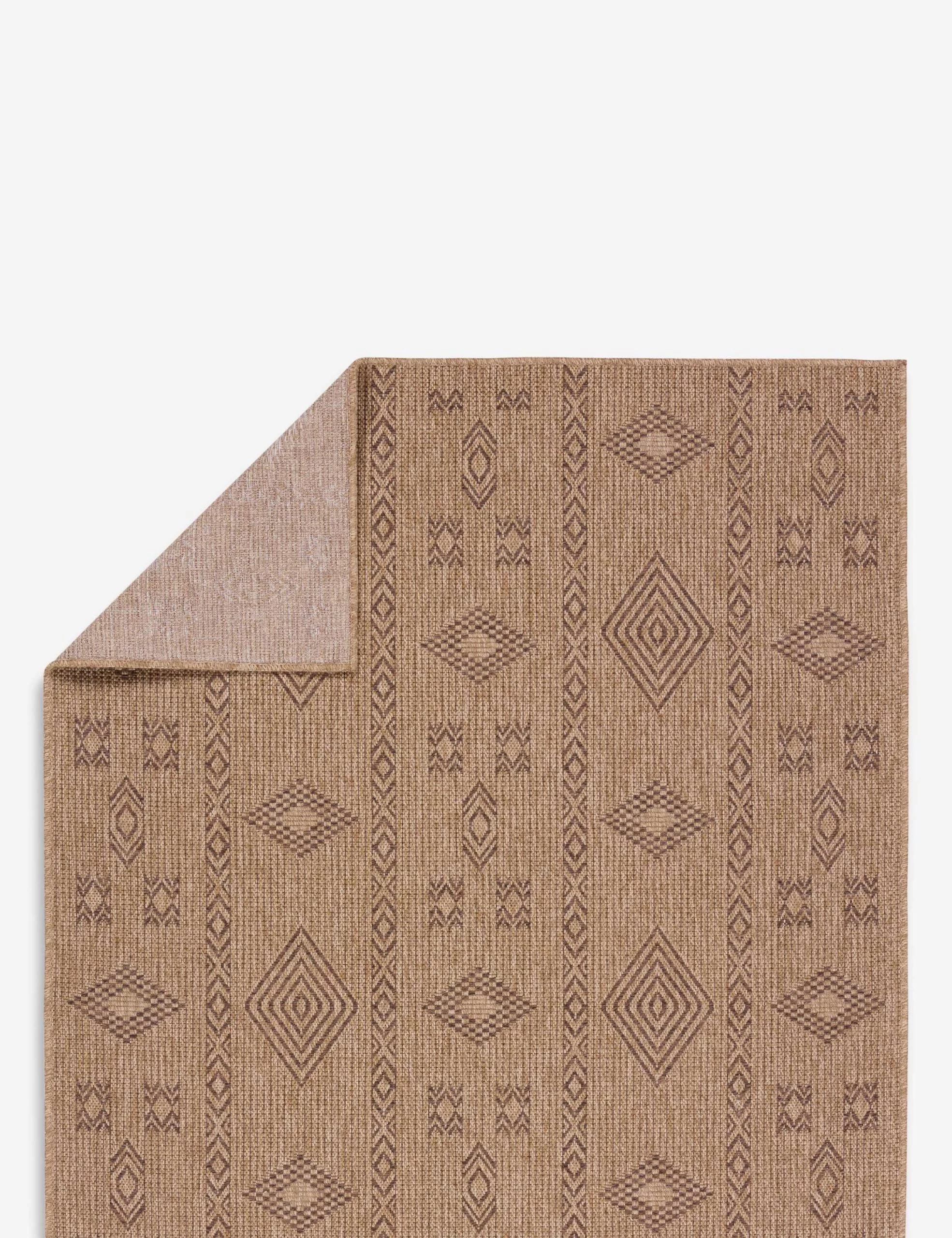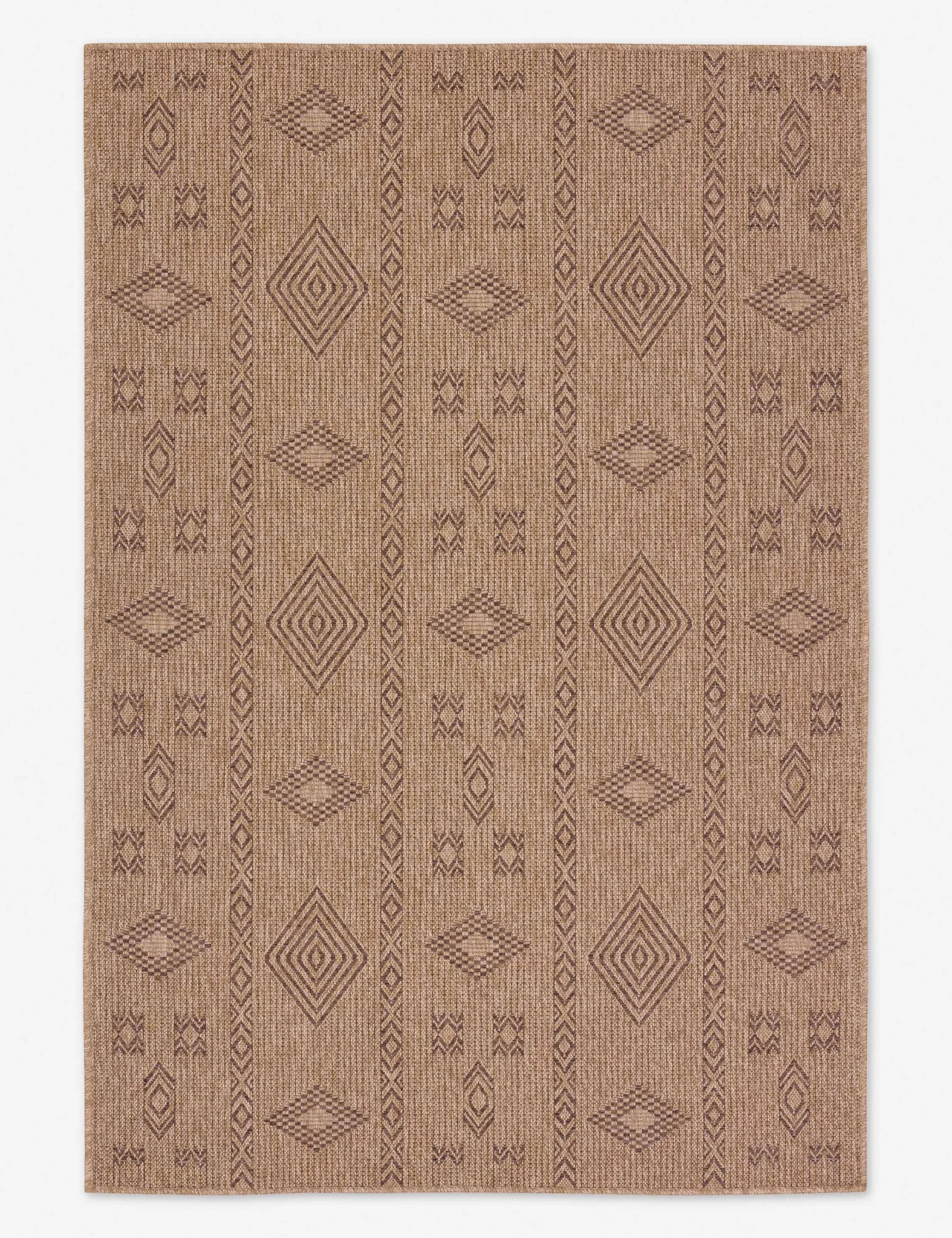 The Bijan rug strikes a timeless look with a minimalist arrangement of intricate geometric symbols. An earthy palette grounds the eye-catching design. This modern floor rug is made with stain-resistant fibers, offering a practical touch for high-traffic and outdoor areas.