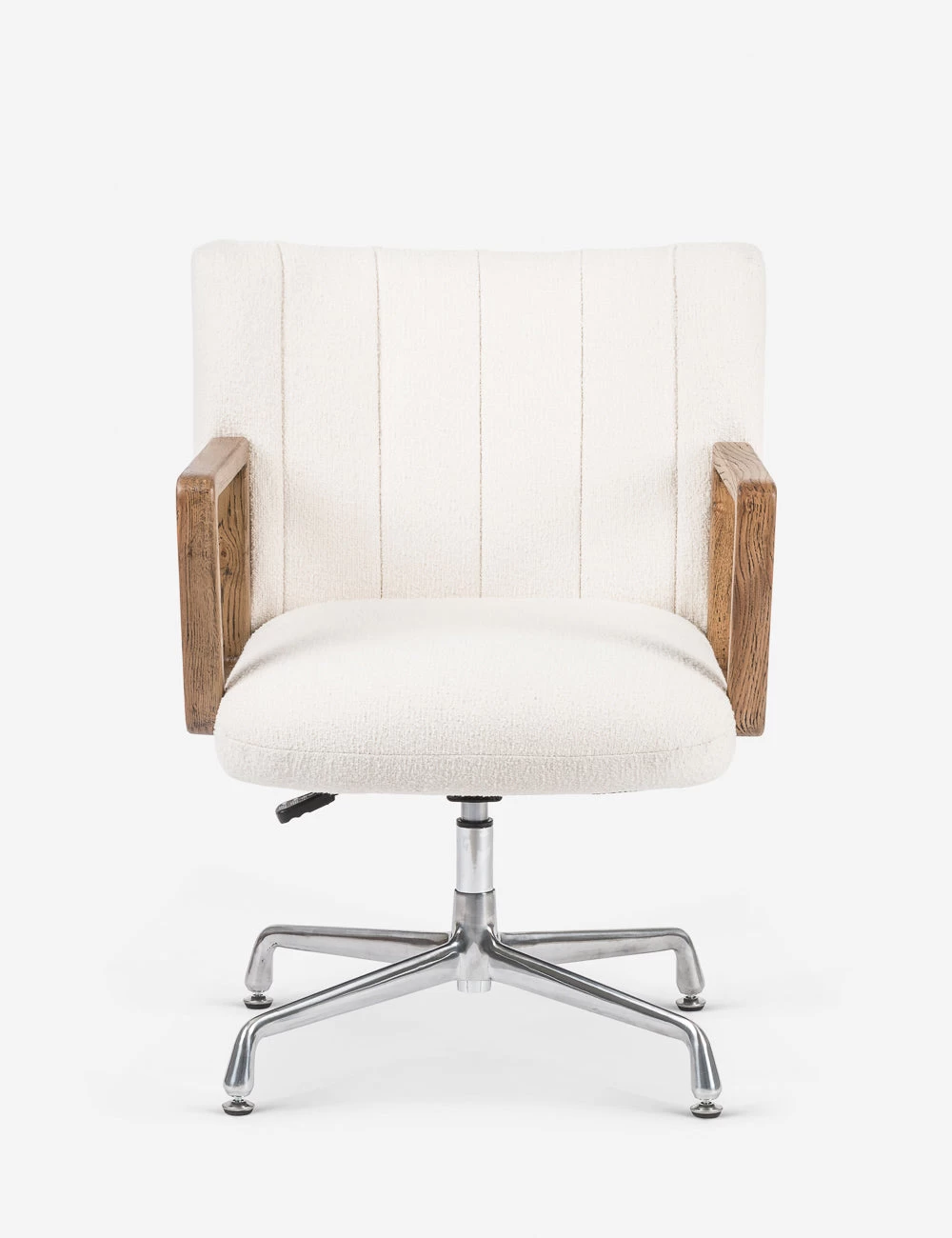 Elevate the tone of your home office or workspace with this chicly modern desk chair. Set on an adjustable swivel base, solid oak arms frame a softly upholstered seat for a mixed-material pairing you will love.