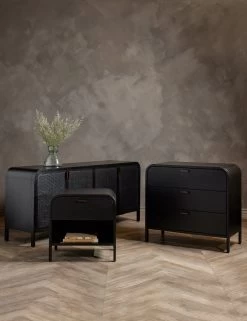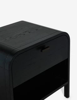 The finish of this nightstand warmly compliments the arched corners of its understated design. It is fitted with a sleek iron pull, a roomy drawer, and an open shelf to offer storage and style in equal measure. Place this oak wood bedside table in a modern, airy bedroom.