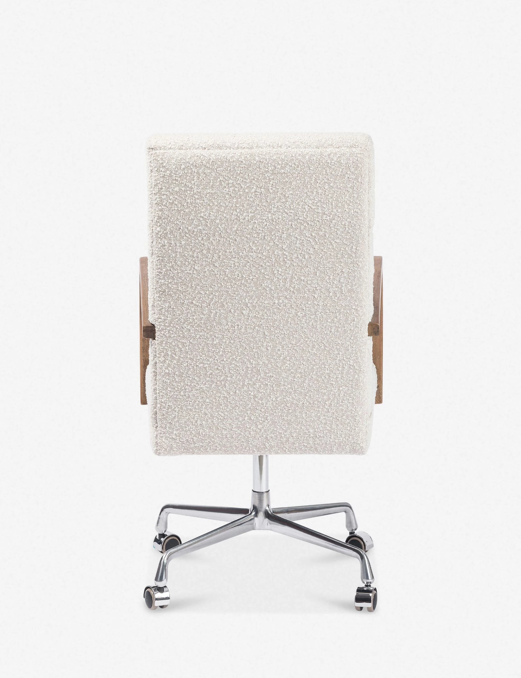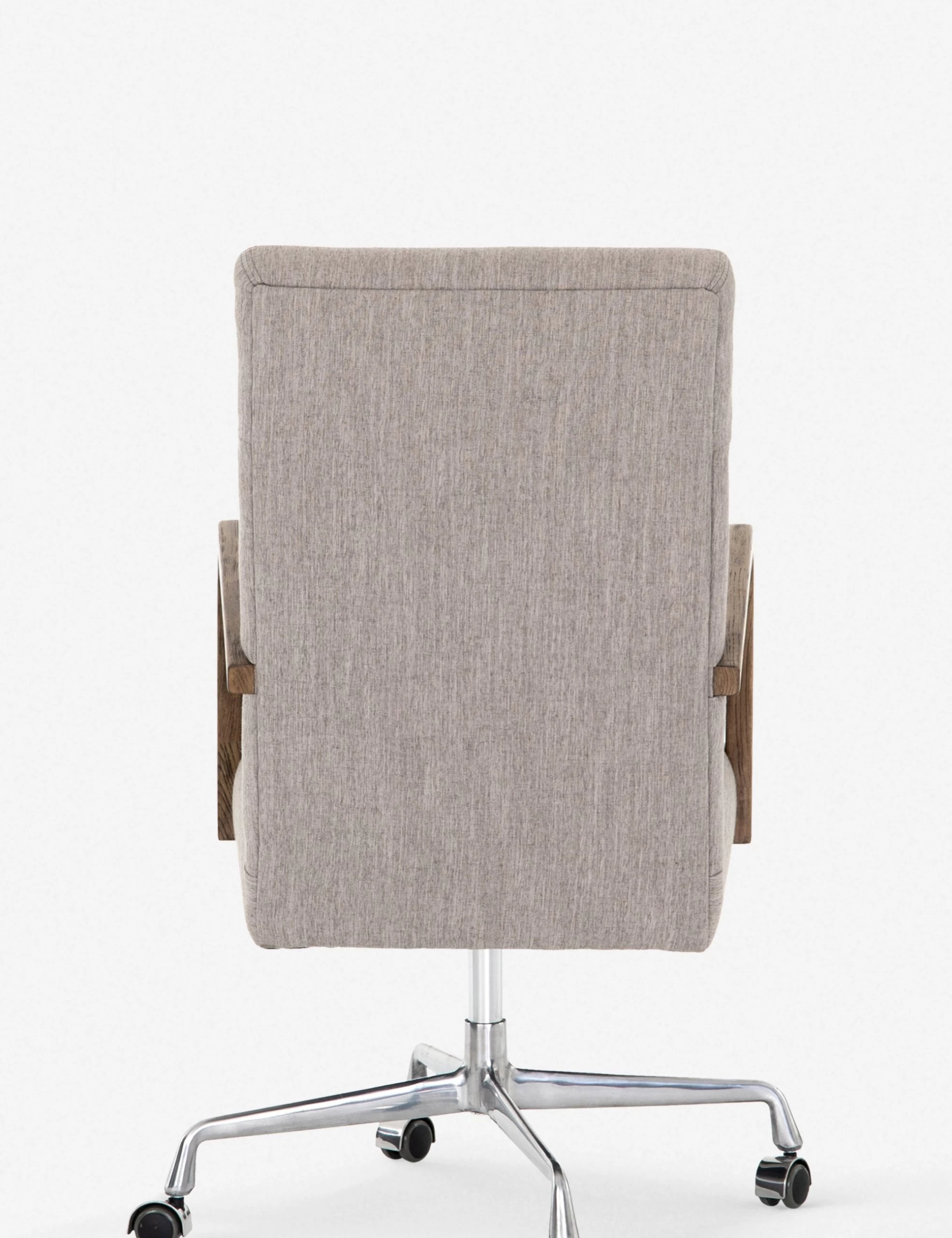 Refresh your home office with this polished update on a classic desk chair design, wrapped in upholstery for textural comfort. Curved wooden arms and a stainless steel caster base provide functional appeal without compromising style—the perfect accent for a room where traditional elements meet modern touches.