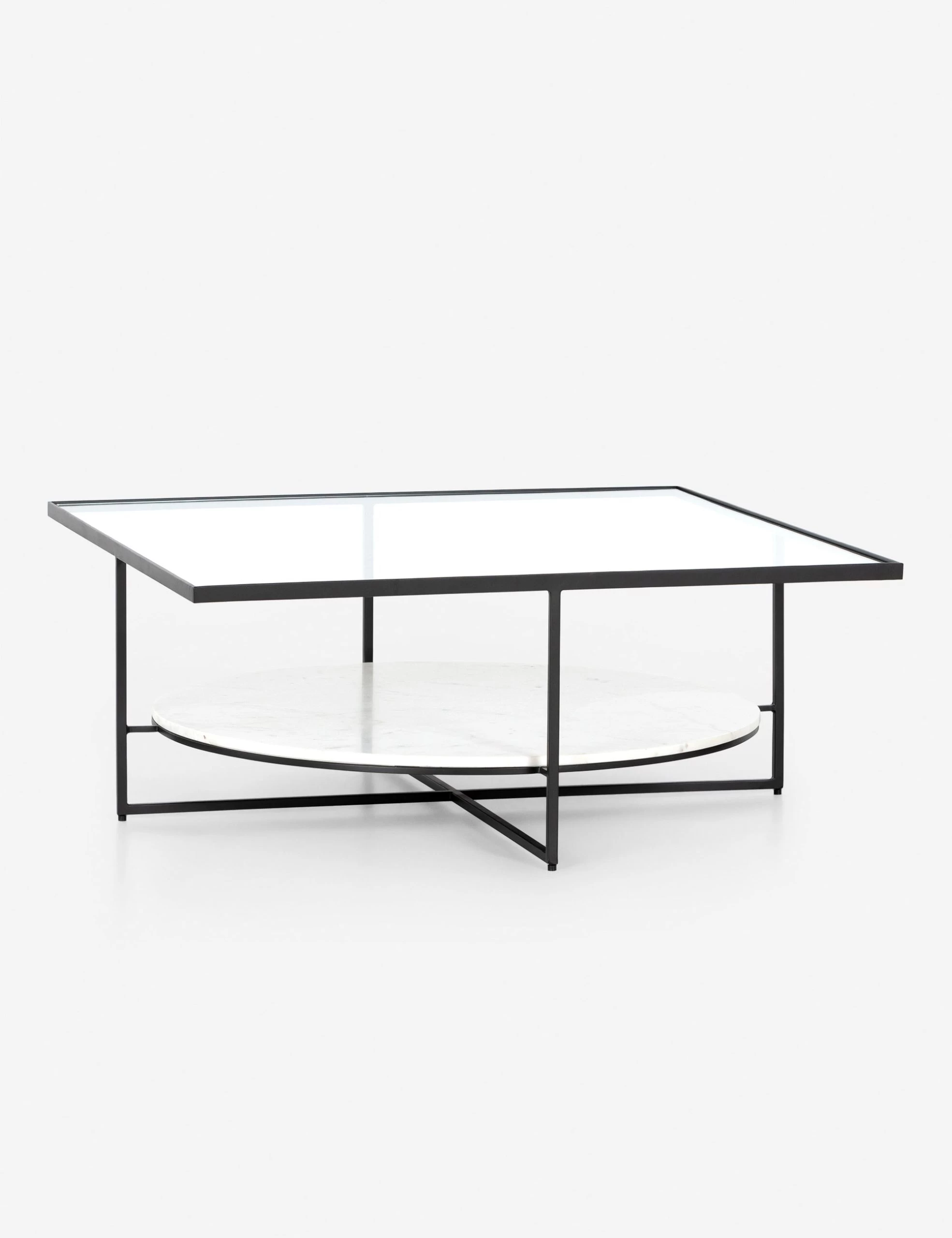 Marked by refined minimalism and a striking geometric silhouette this coffee table is a statement piece for the middle of the room. A round white marble shelf and square tempered glass top are suspended by a bronze-finished iron frame to create an angular, floating look. This is the perfect middle table to bring clean lines and visual appeal into an airy transitional space.
