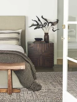 An easy upgrade for your modern bedroom, this wooden nightstand features dimensional design on the front for a sculptural edge. The natural textures and color variations in the wood bring an organic feel to this unique bedside table.