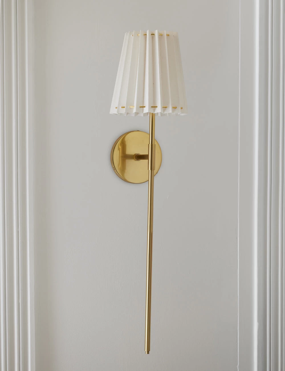 Blending timeless notes with a modern design, this sconce features a sleek arm fitted with a pleated shade for a chicly balanced profile. Metal rings thread the pleated shade at top and bottom, adding a touch of glamour to this wall sconce—perfect for a finishing touch of light from your dining room to your lounge.