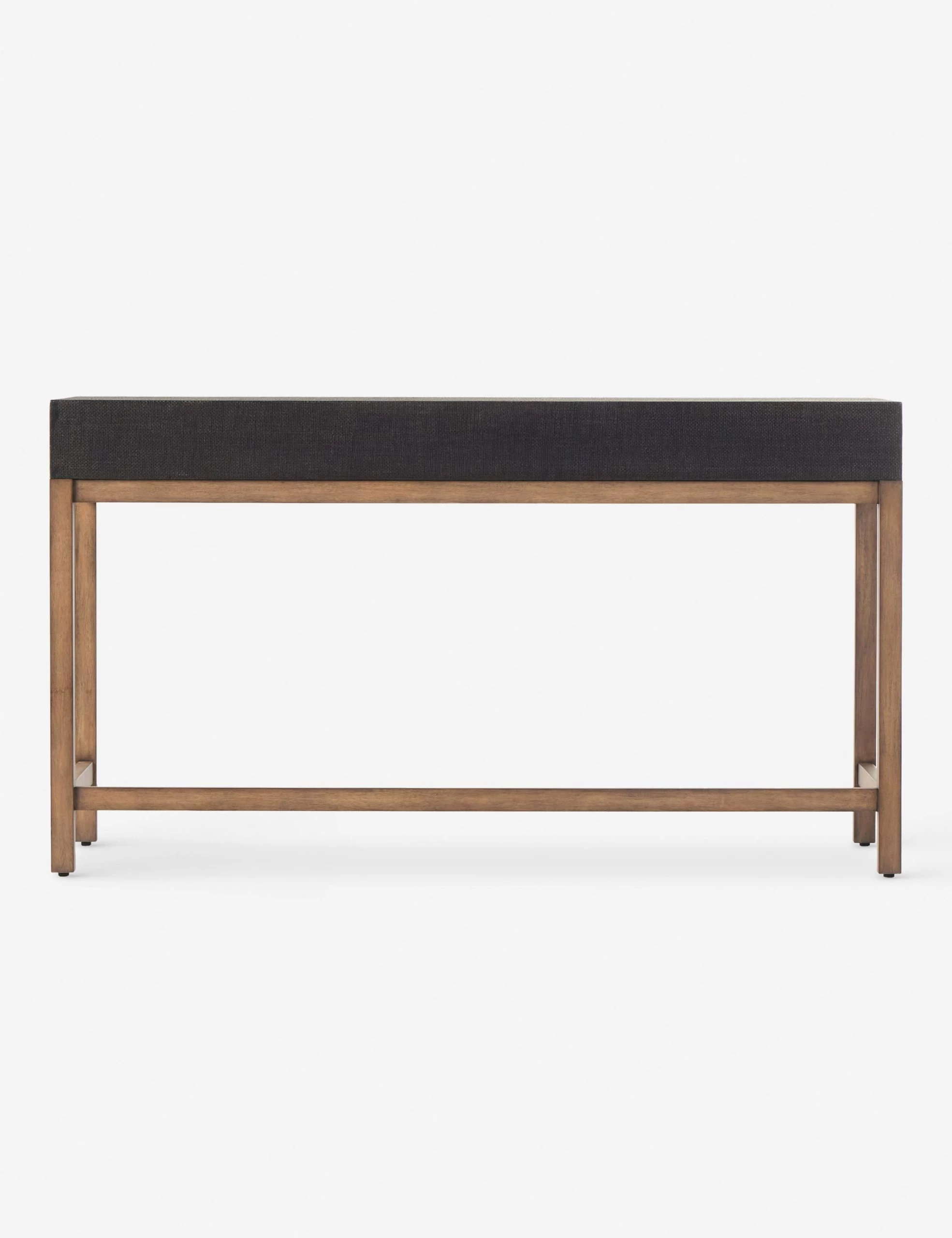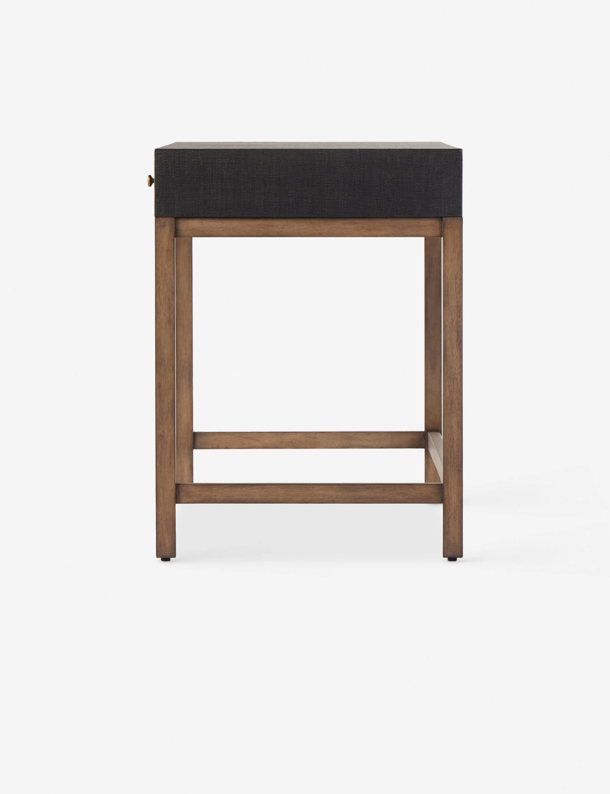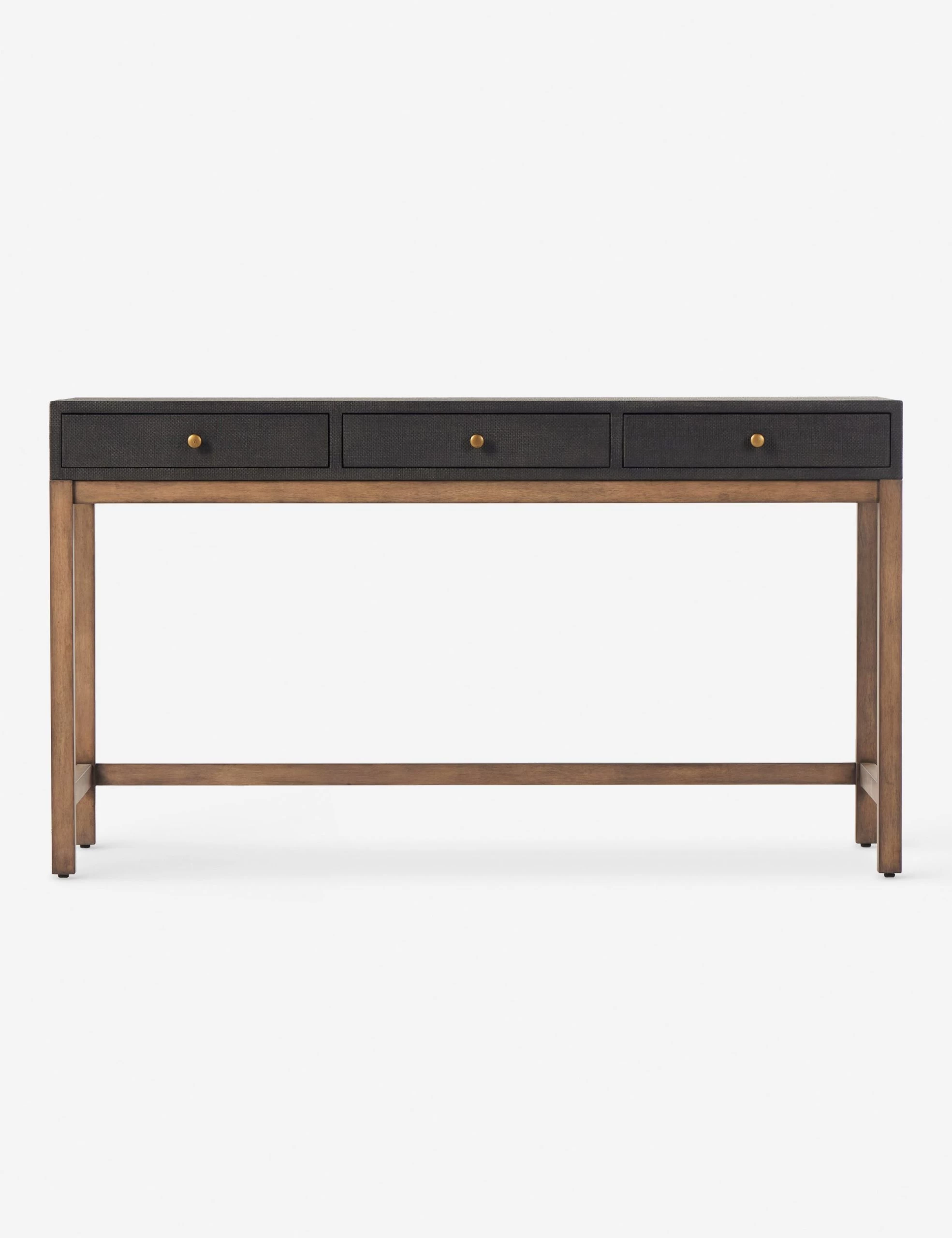 This woven raffia desk offers textural impact with a clean, linear silhouette. The two-tone finish of the black raffia against the warm mahogany base adds impact for a modern look and feel. Three drawers bring the perfect touch of storage for a chic yet functional workspace.