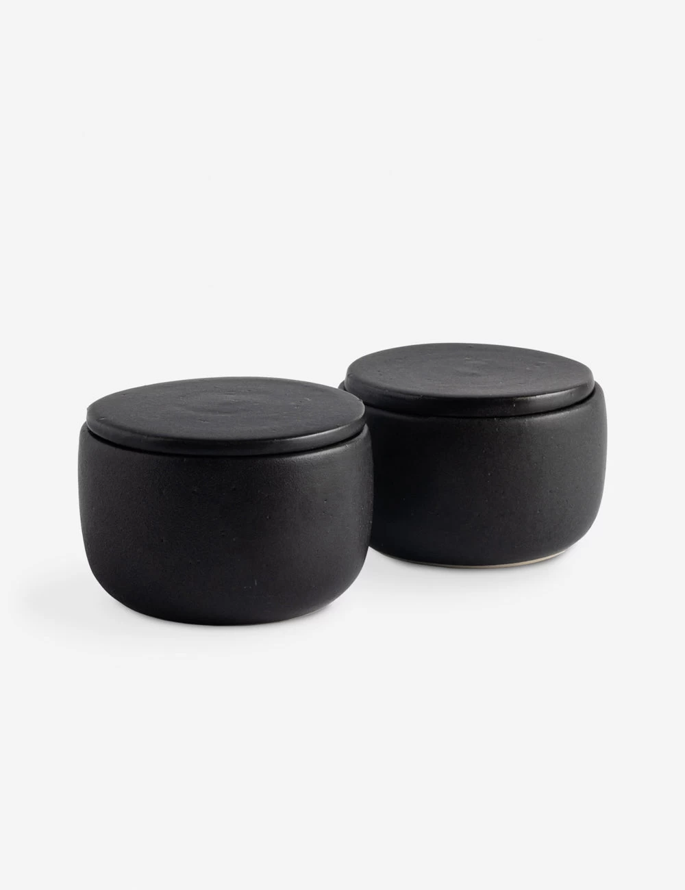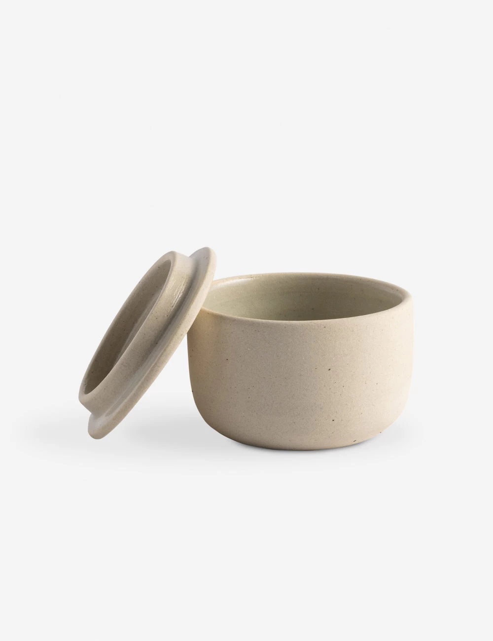 The Diem kitchen collection is crafted in the Talavera ceramic style to offer a beautiful earthenware dish set with a simple grounding tone. These small jars each feature a matching lid and are ideal for quick pinches of salt, table sugar, or bespoke spice blends.