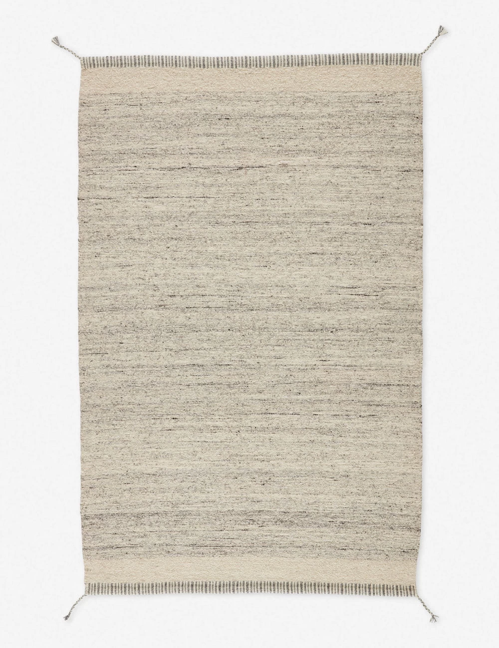 Hand-loomed of texture-rich wool, this area rug offers a minimalist look with its heathered gray-and-ivory tones. A linear border and braided tassels combine to make this rug a versatile statement piece.