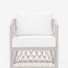 A curving brushed brass frame gracefully cradles this luxurious accent chair. Sloping lines and a low-slung design are reminiscent of a mid-century aesthetic and the rich fabric has a textured, boucle-like feel.