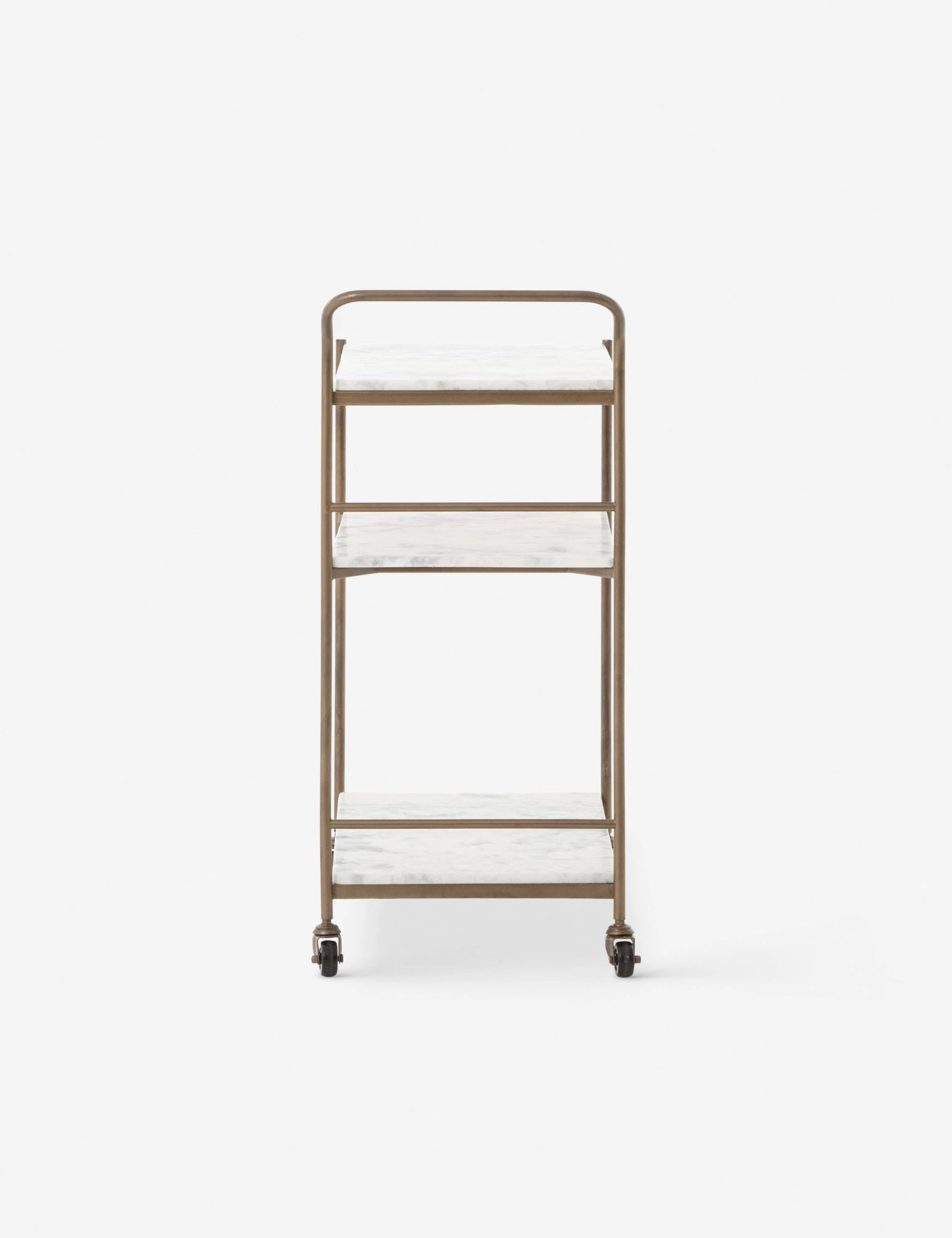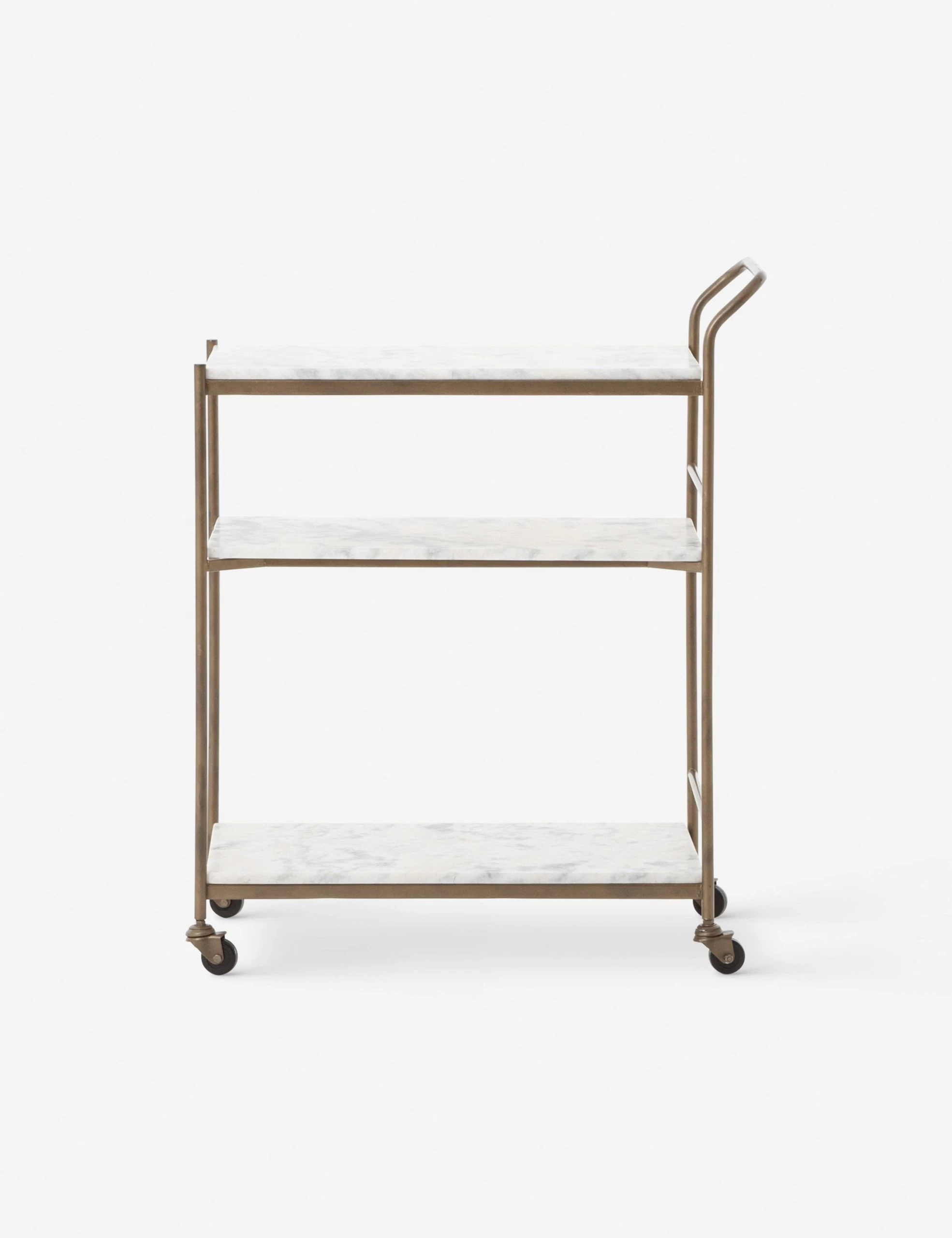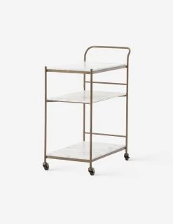 Add a dash of polish to your look with this chic bar cart. White marble shelving offers a luxe touch to the antique brass frame, while casters let you bring the cart to the party for dynamic entertaining in your living space, dining room, or kitchen.