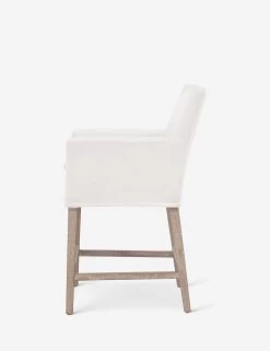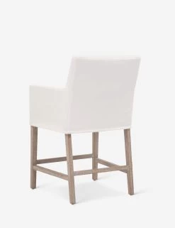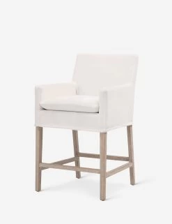 In a crisp white shade, this slipcovered counter stool is a clean-lined and comfortable addition to your dining space. Its performance fabric upholstery wraps around a solid oak base and then finished with arm rests and a cozy seat cushion. Style this stool with a marble-topped kitchen island or glossy white-finished breakfast counter.
