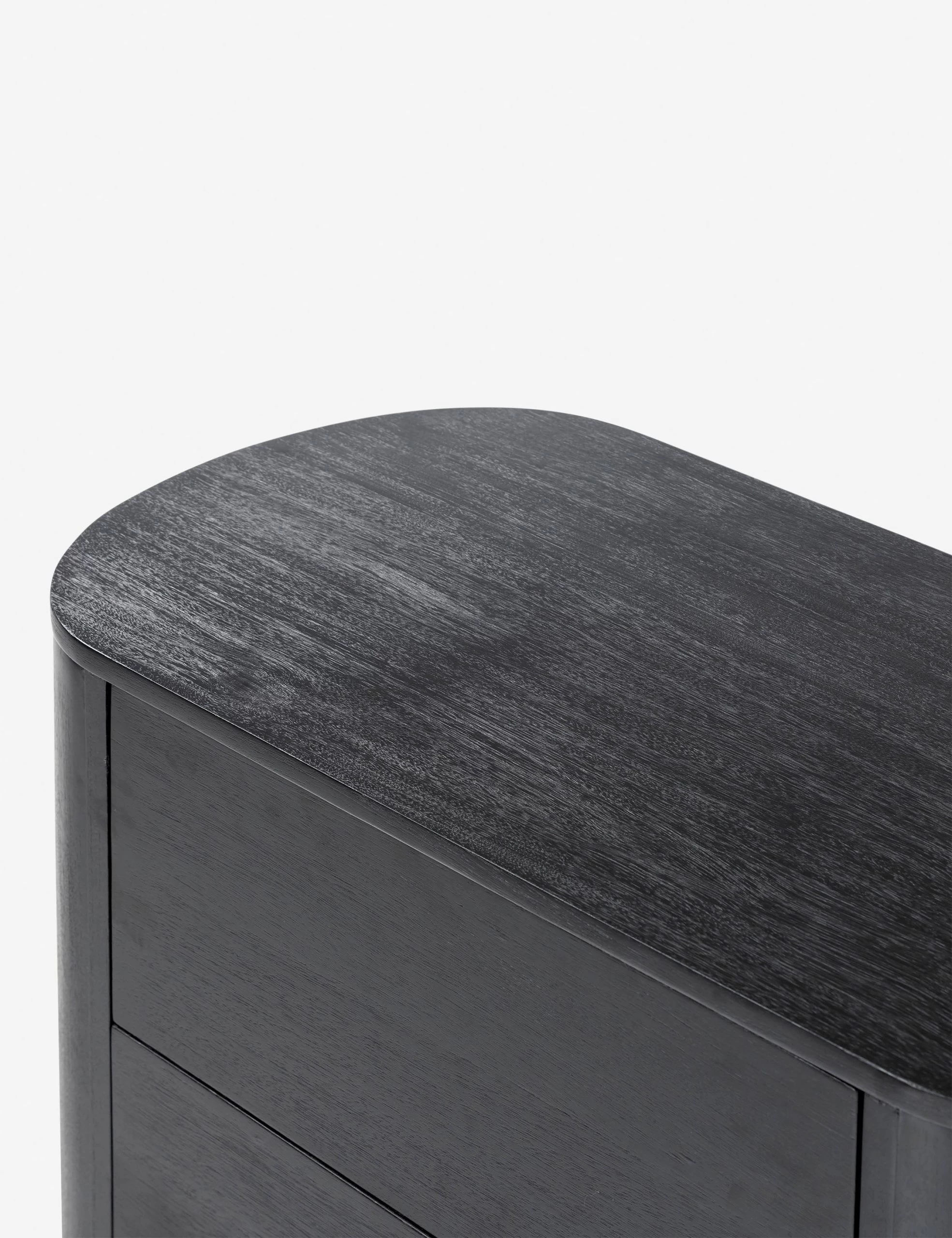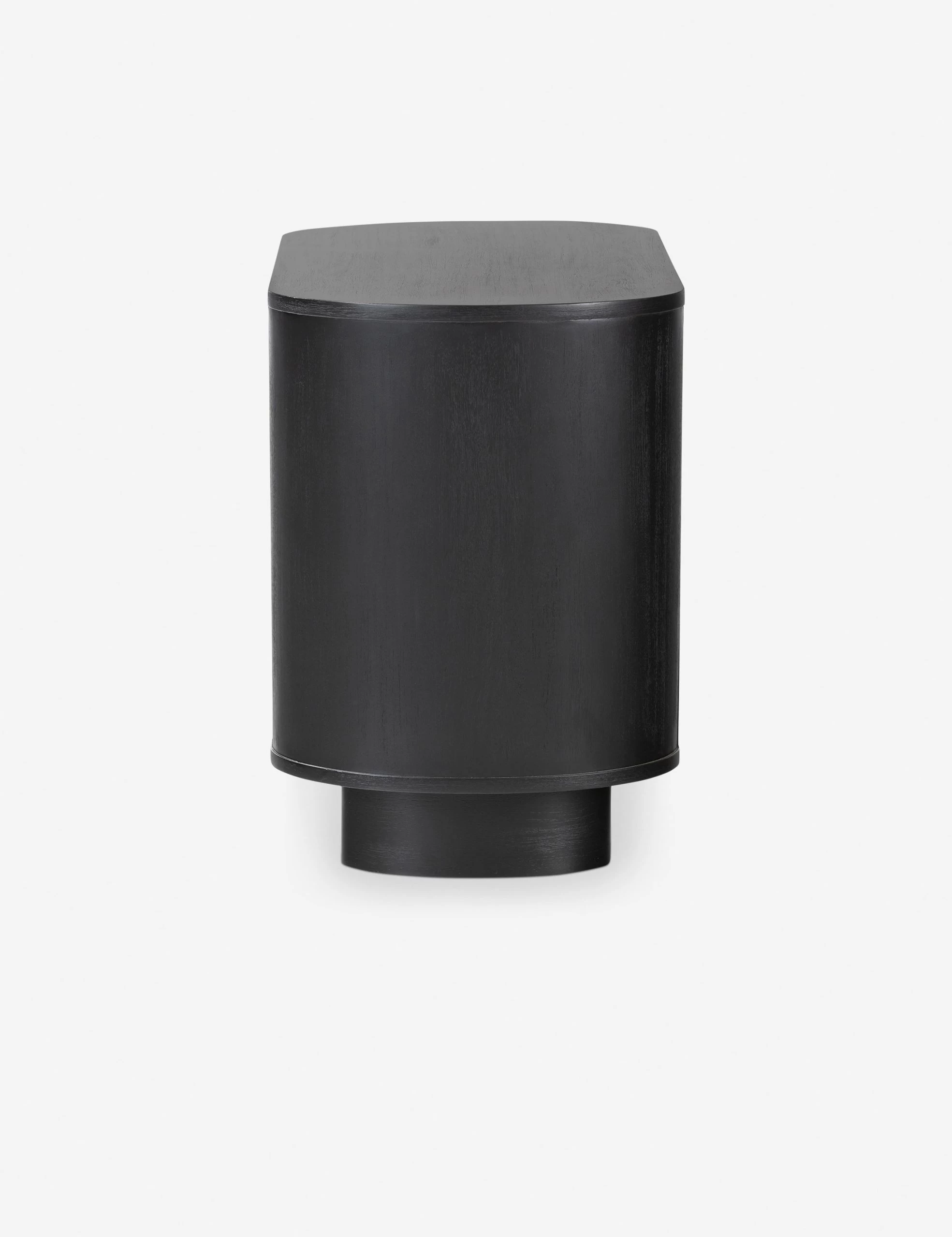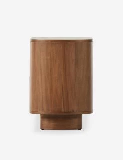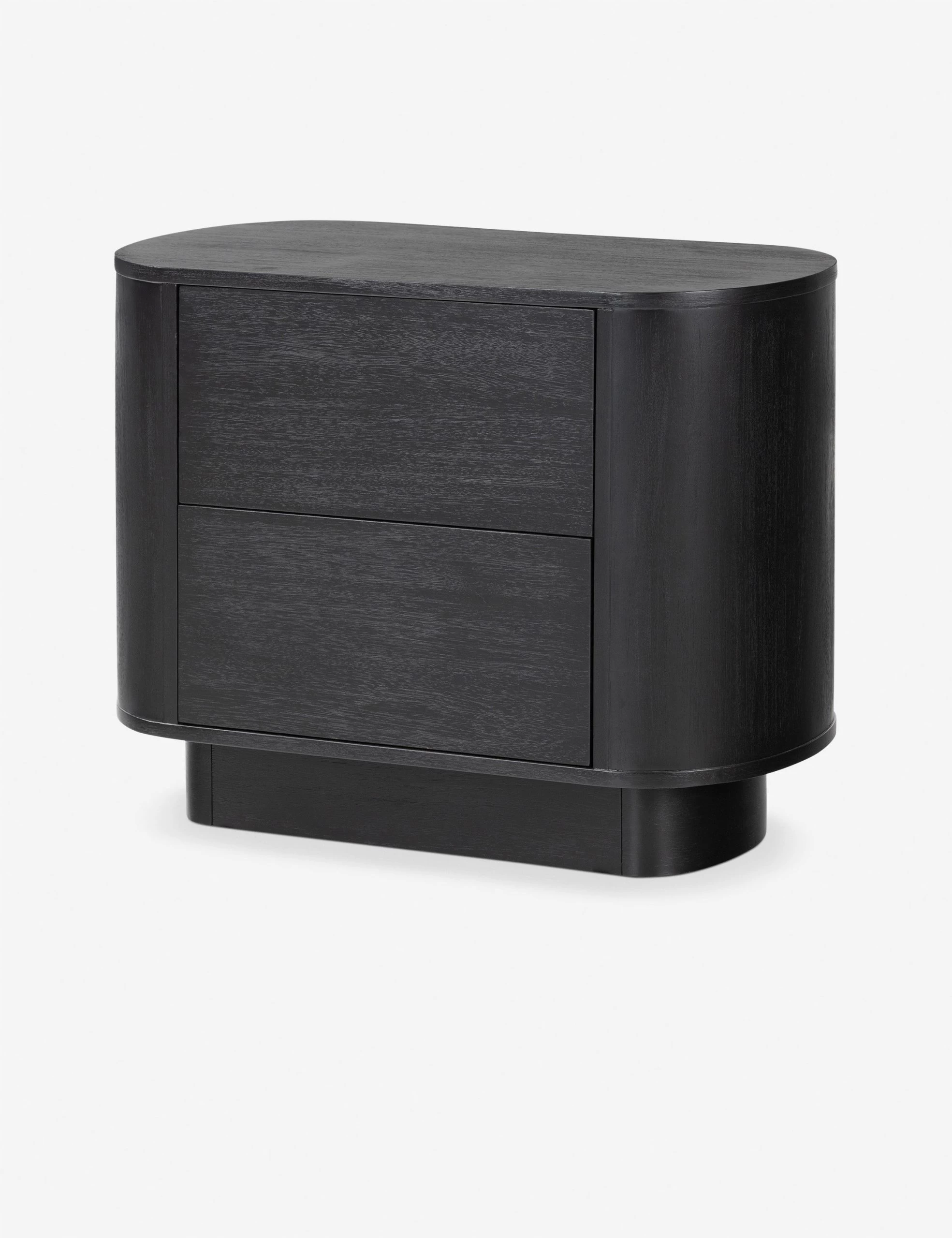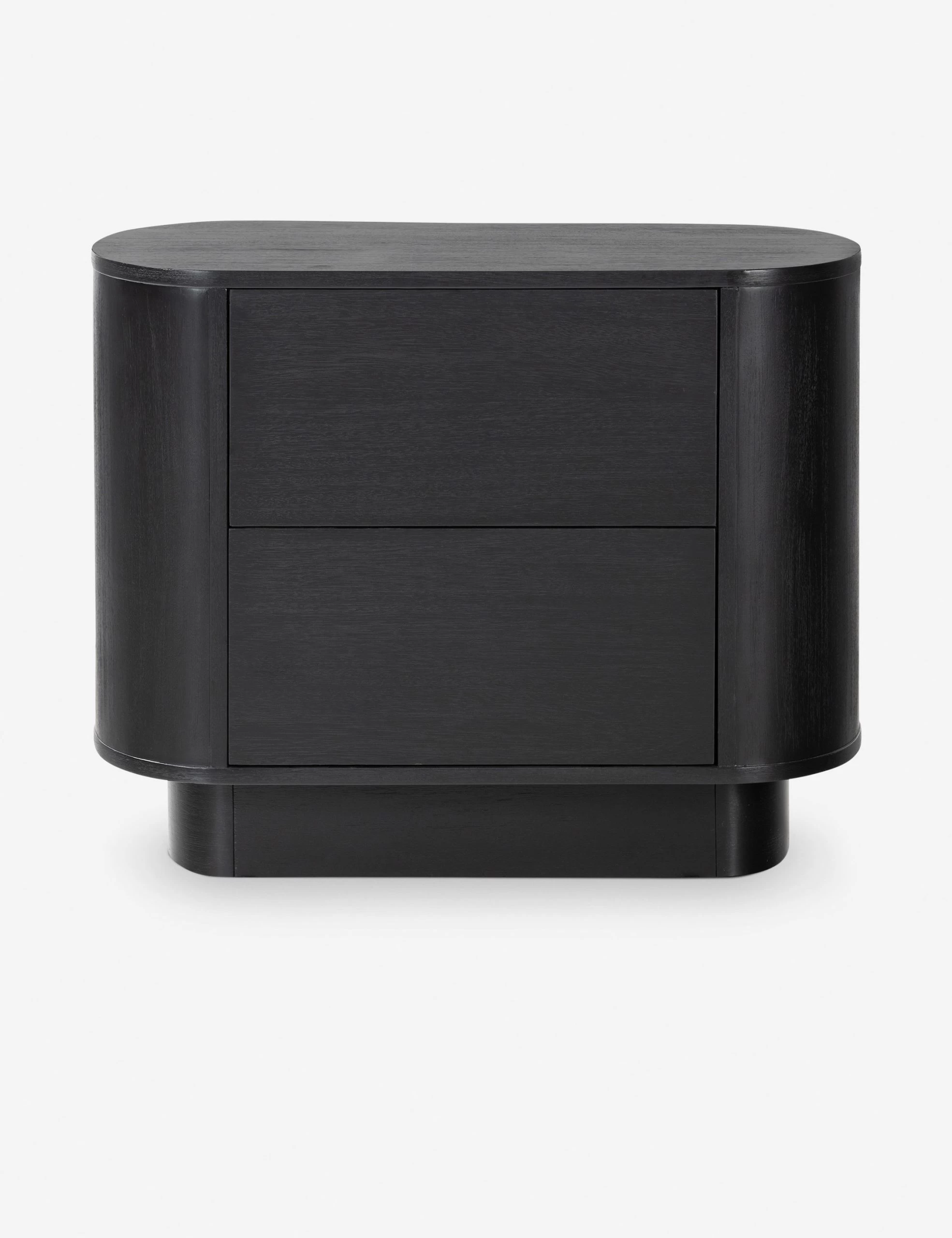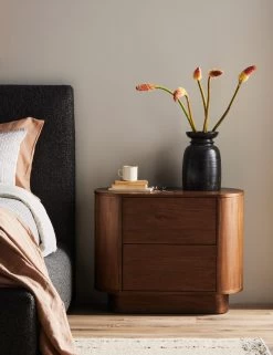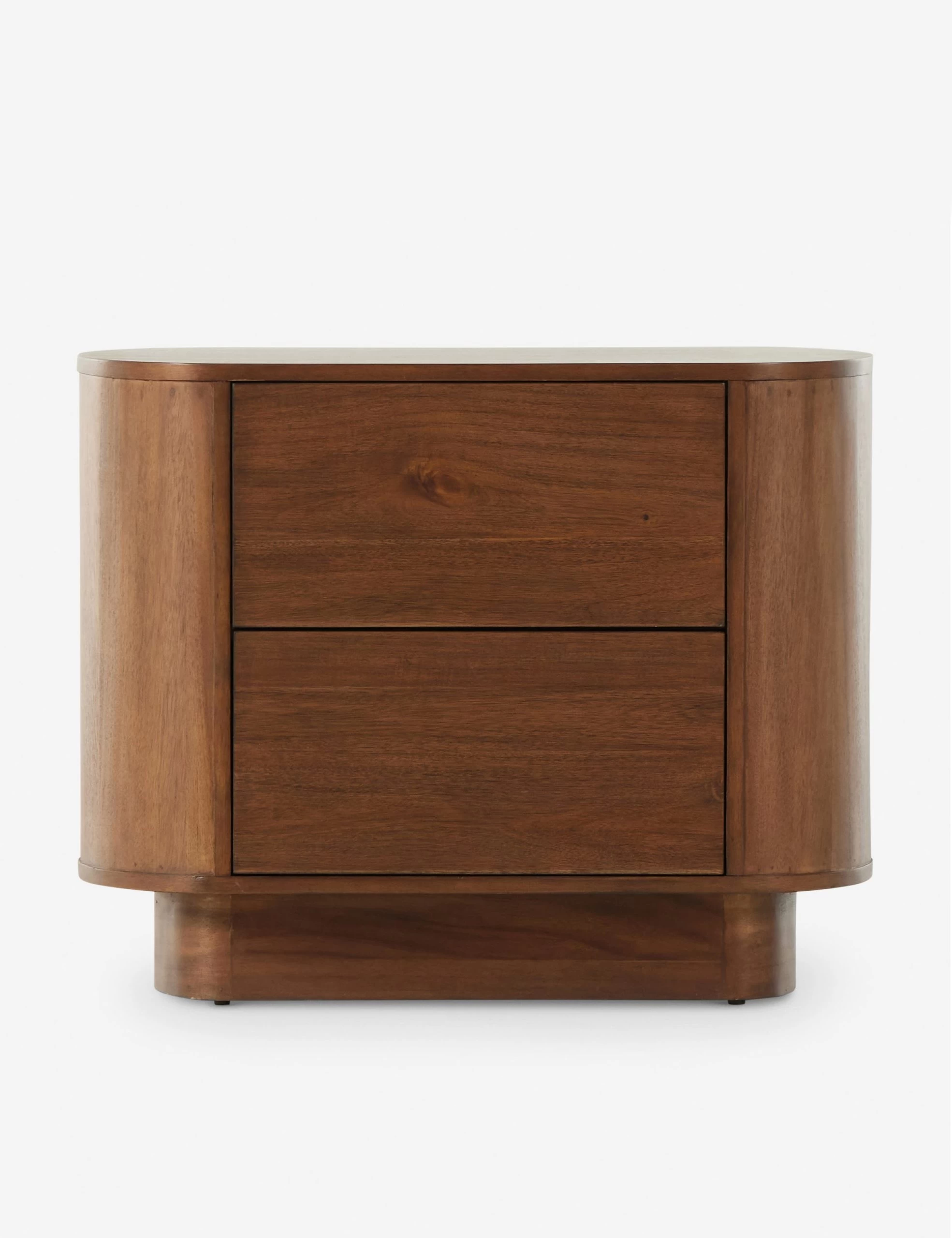 Clad in acacia, the soft lines of this nightstand are reflected in the plinth base to offer a sturdy design with a gently rounded profile that feels sculptural yet grounded. This modern nightstand features two deep drawers with soft-close slides, offering an elegant touch of bedside storage.