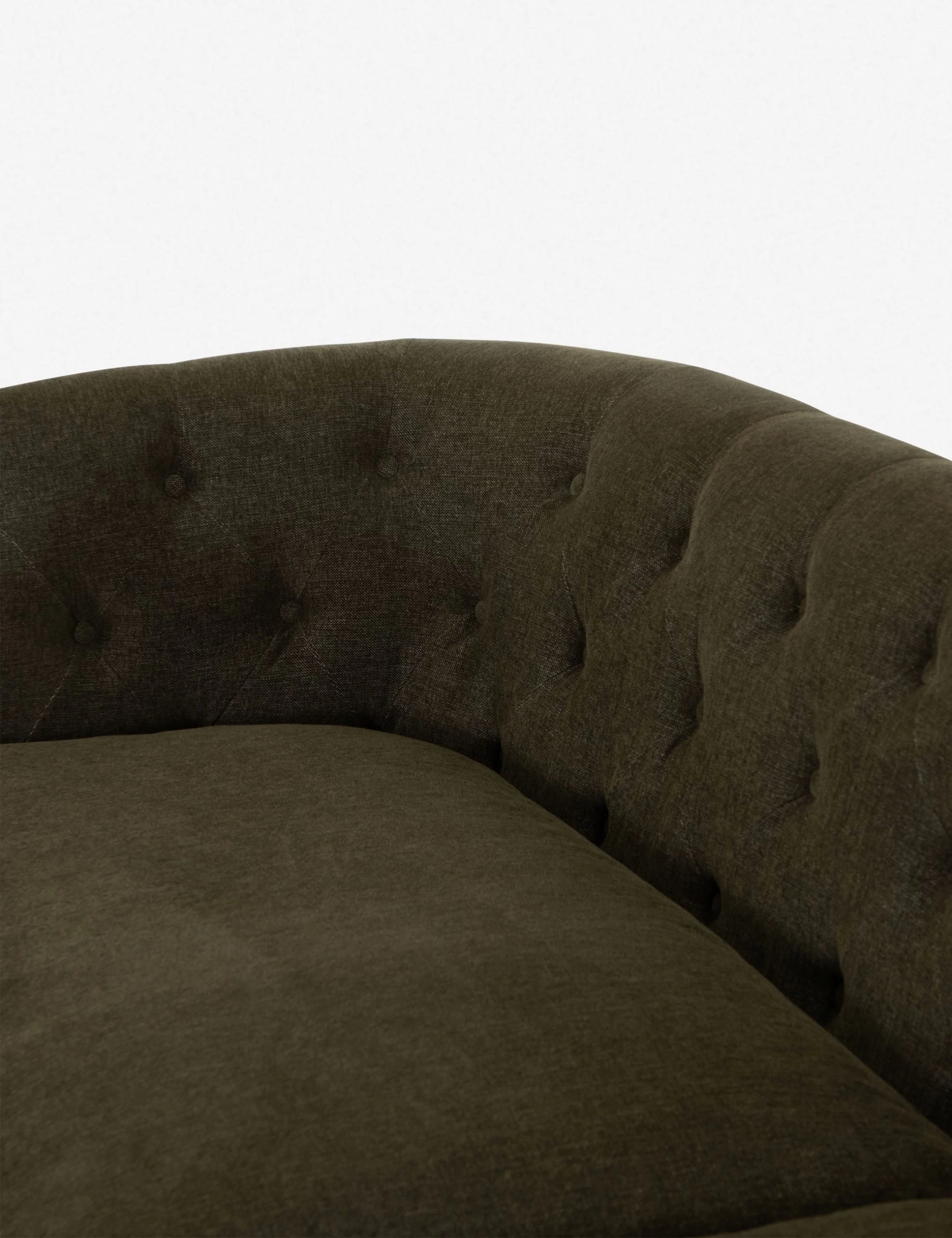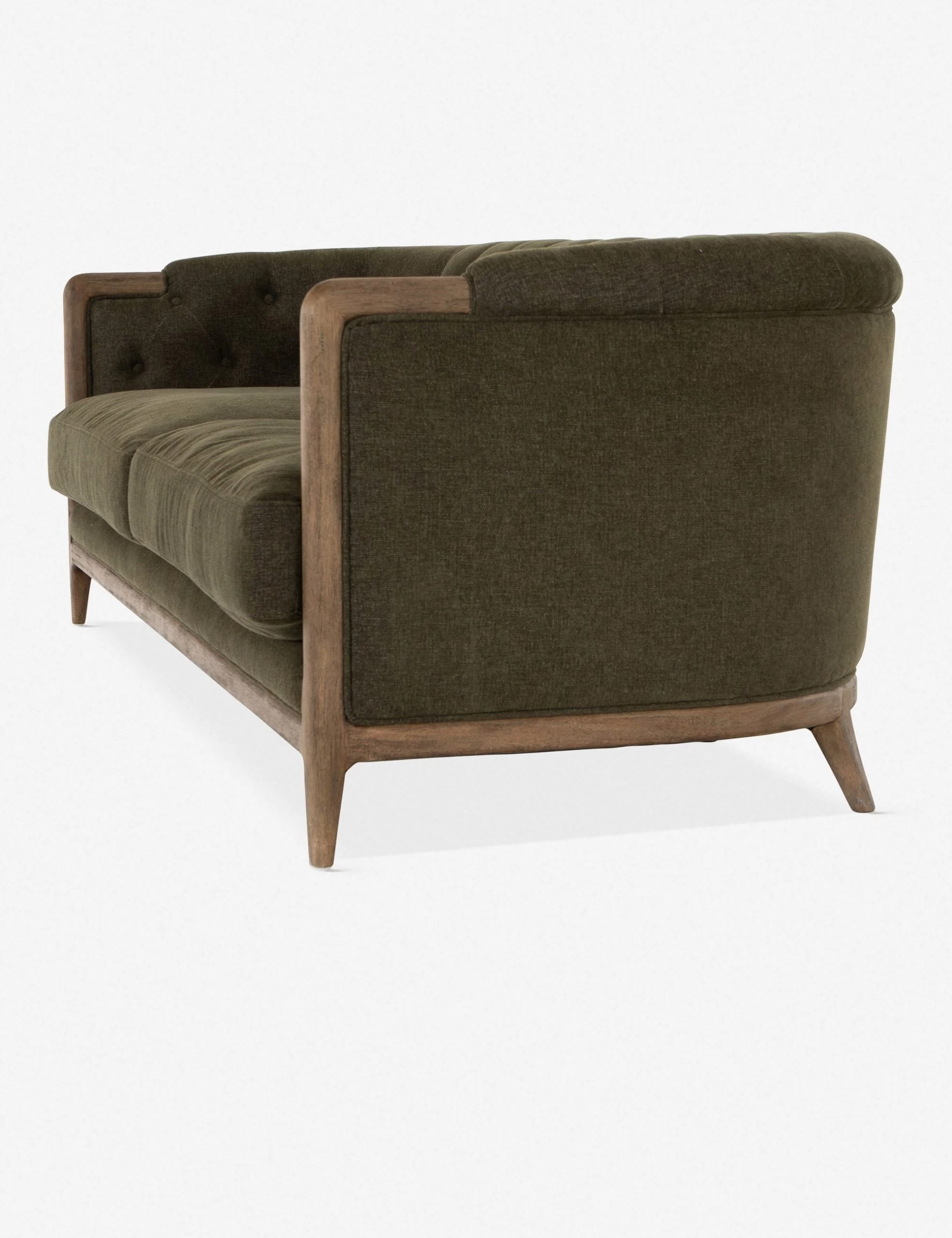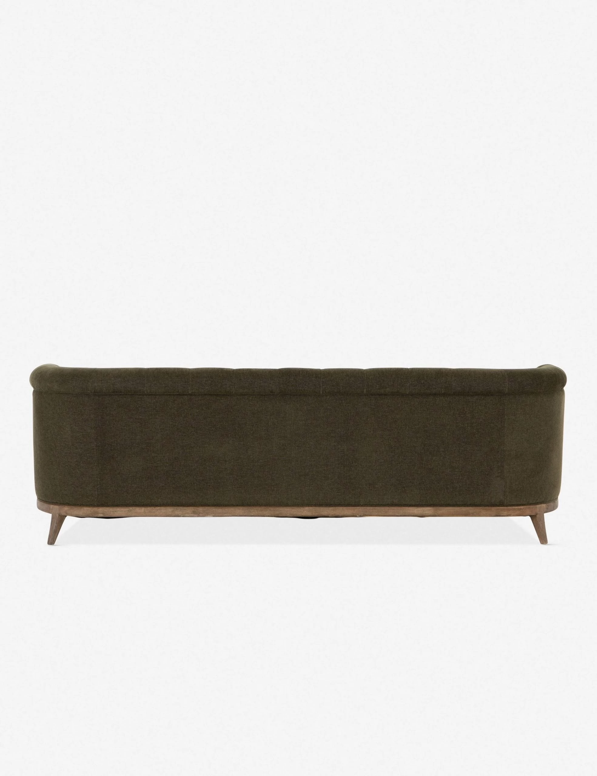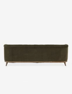 Instantly transform the look of your room with the Parisian appeal of this living room sofa. Wrapped in richly-textured, earthy olive green upholstery, its exposed wooden frame immediately catches the eye. Button tufting, a curved back, and rolled arms finish the traditional look, making this sofa a perfect fit for more formal living spaces.