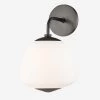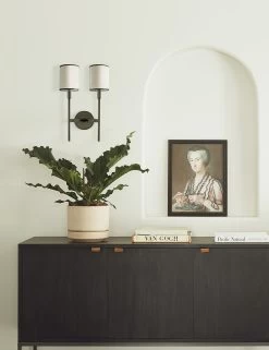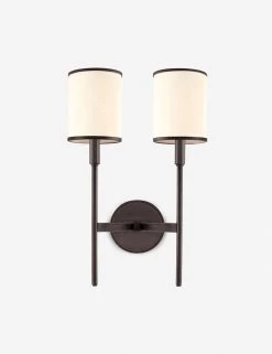 The Gladys collection is characterized by its toothpick-thin rods and piped faux silk shades. This double wall sconce features two individual lights connected to a circular back plate. Clean lines in antique brass give this modern piece a traditional finish.