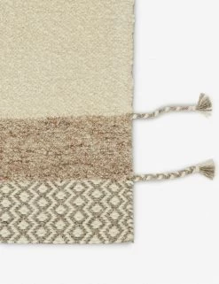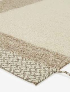 Hand-loomed of texture-rich wool, this area rug offers geometric minimalism with its neutral-hued linear motif. A plush pile, diamond lattice border, and braided tassels combine to make this rug a statement piece.
