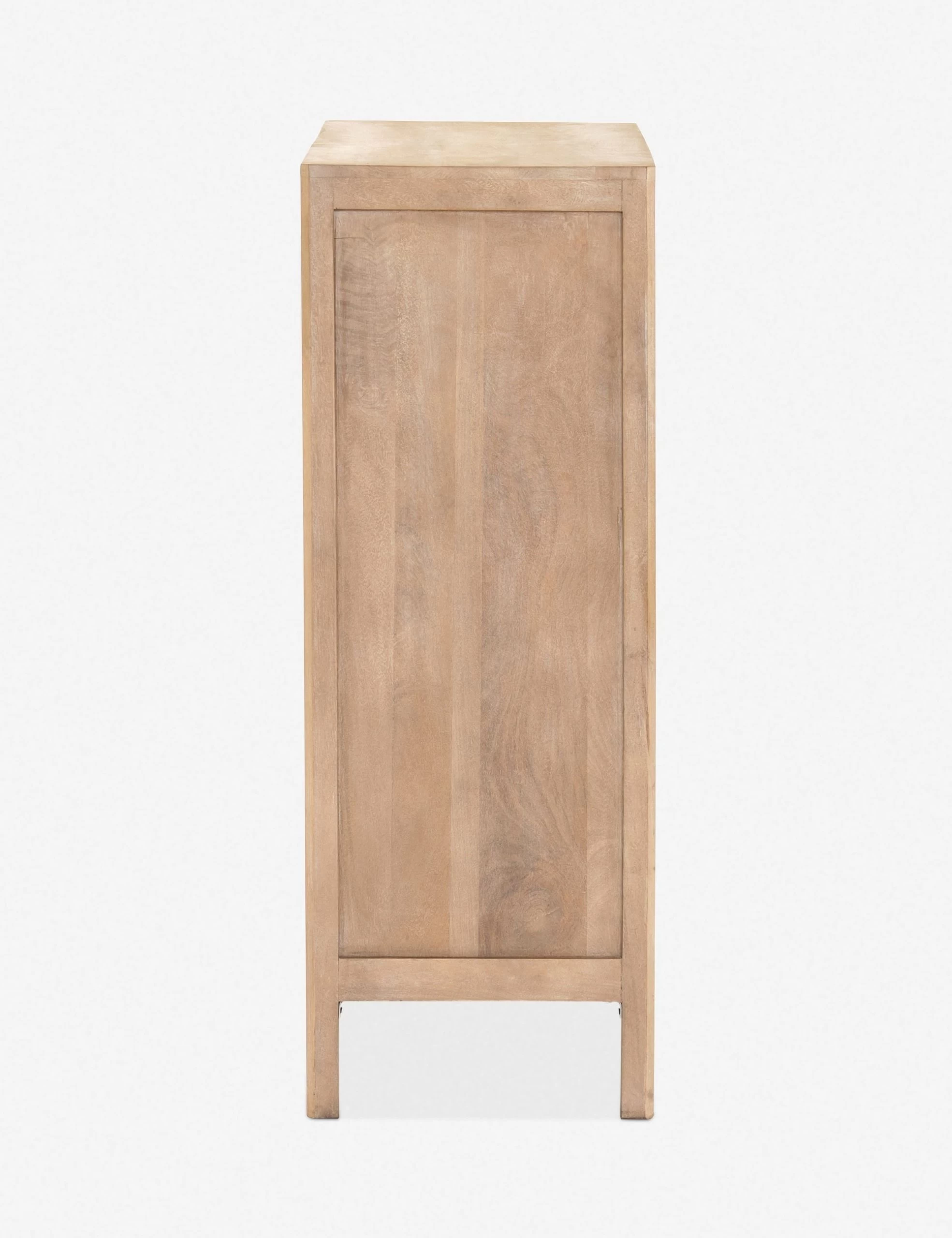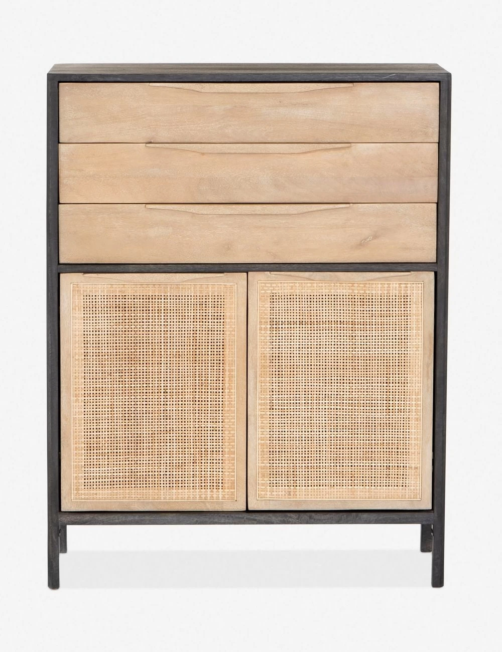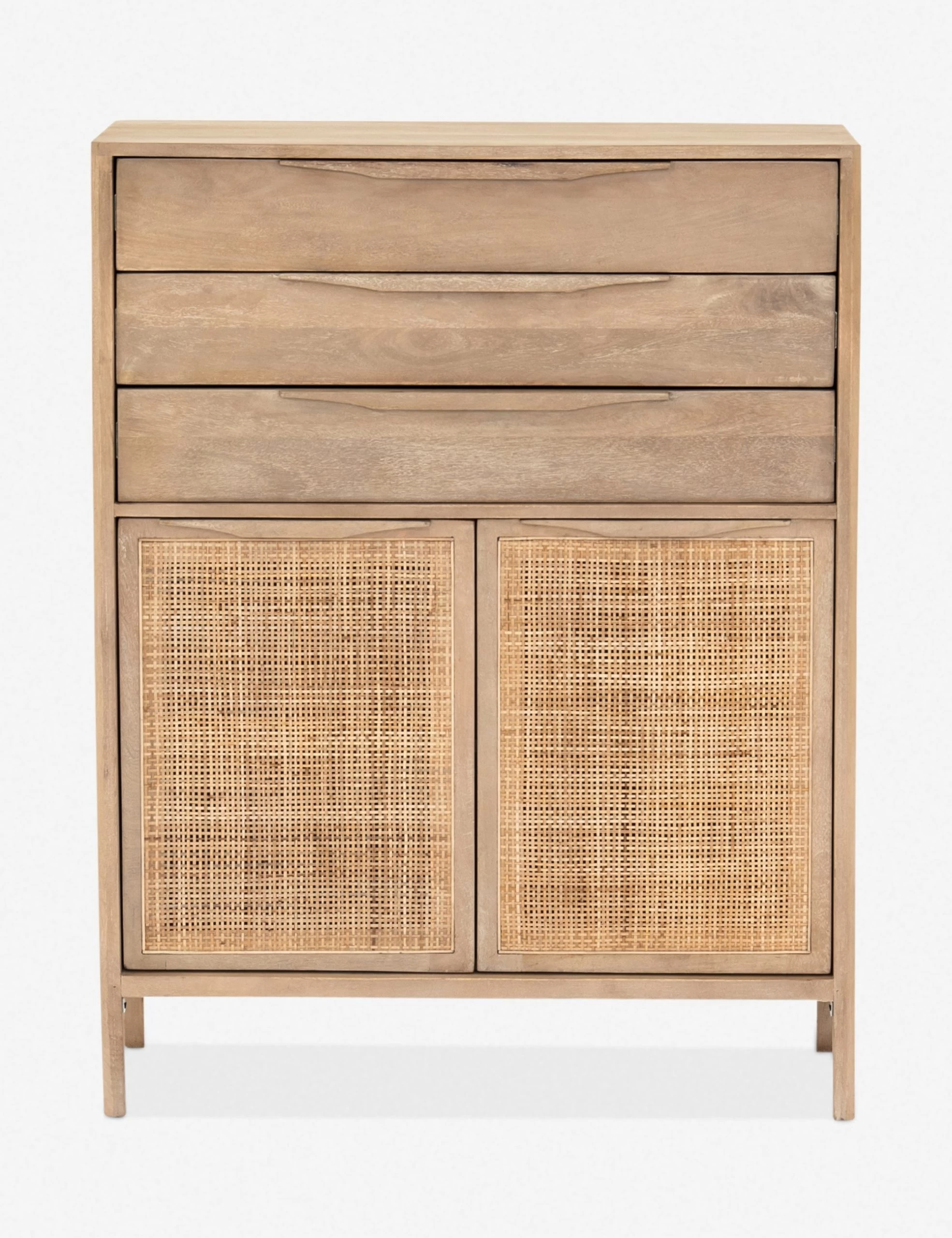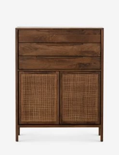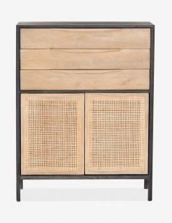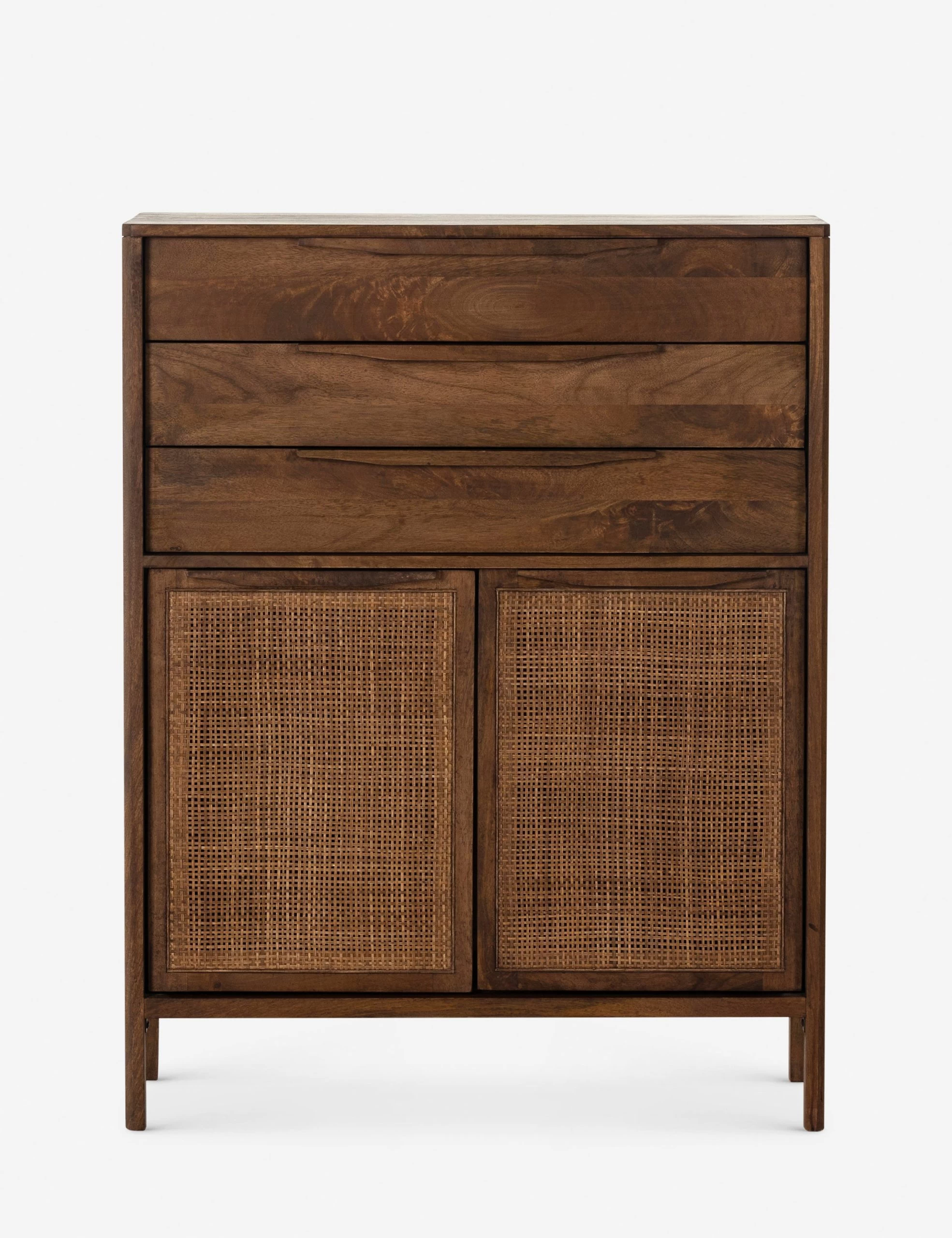 Clean lines and an airy profile bring a cool coastal feel to the Hannah dresser. We love the classic touch of the woven cane front for its natural texture and warmth. This tall dresser features three drawers with cabinet doors below—versatile storage for a bedroom or home office.