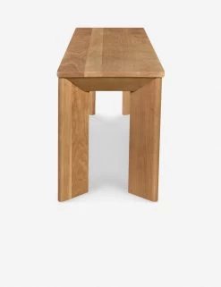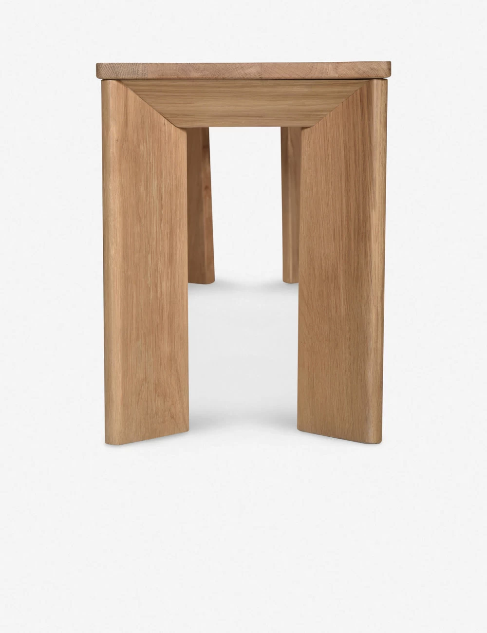 This dining room bench pairs the rustic appeal of a solid oak frame with striking angular legs. Whether providing dynamic seating at a warmly modern table or polishing an entryway or hall, this versatile wooden bench is a sharp addition to your look.
