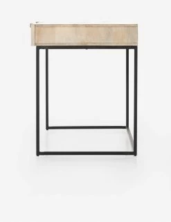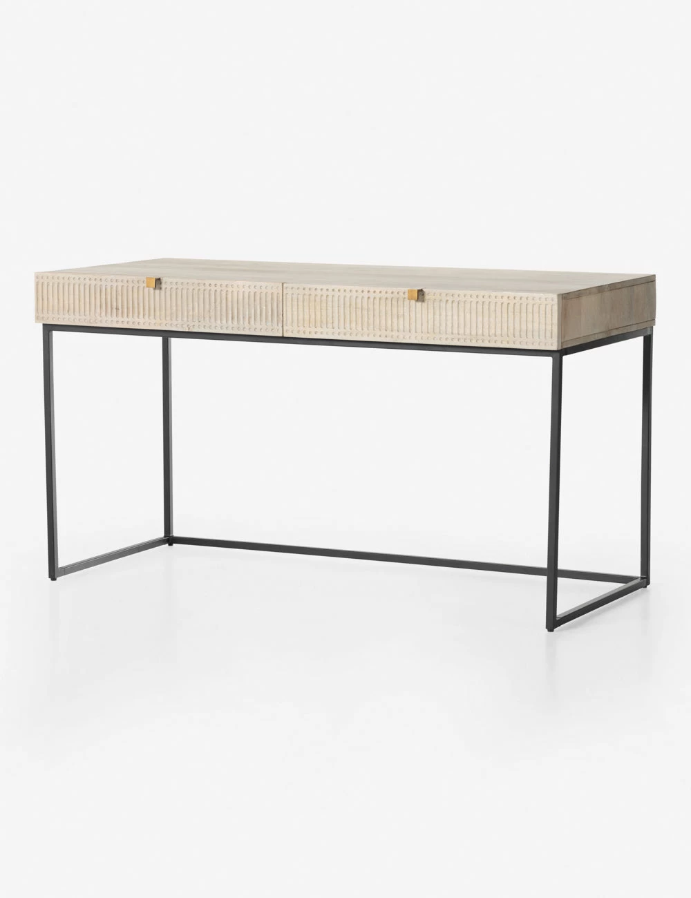 Clean lines create chic appeal in this writing desk design. A light finish highlights the textural detail of the two-drawer wood top while the slim iron frame creates an airy silhouette for a modern home office feel.