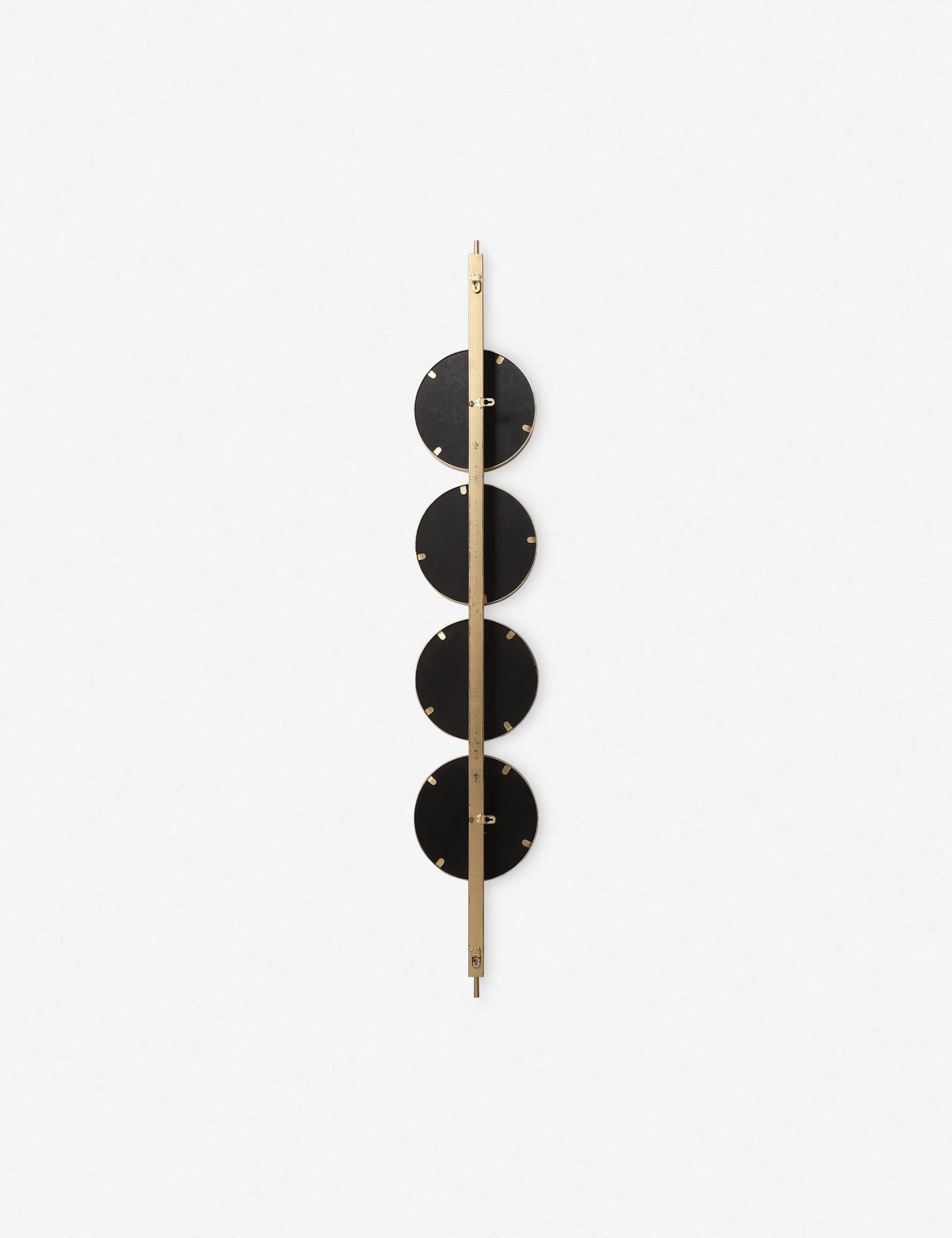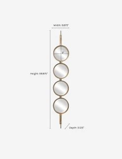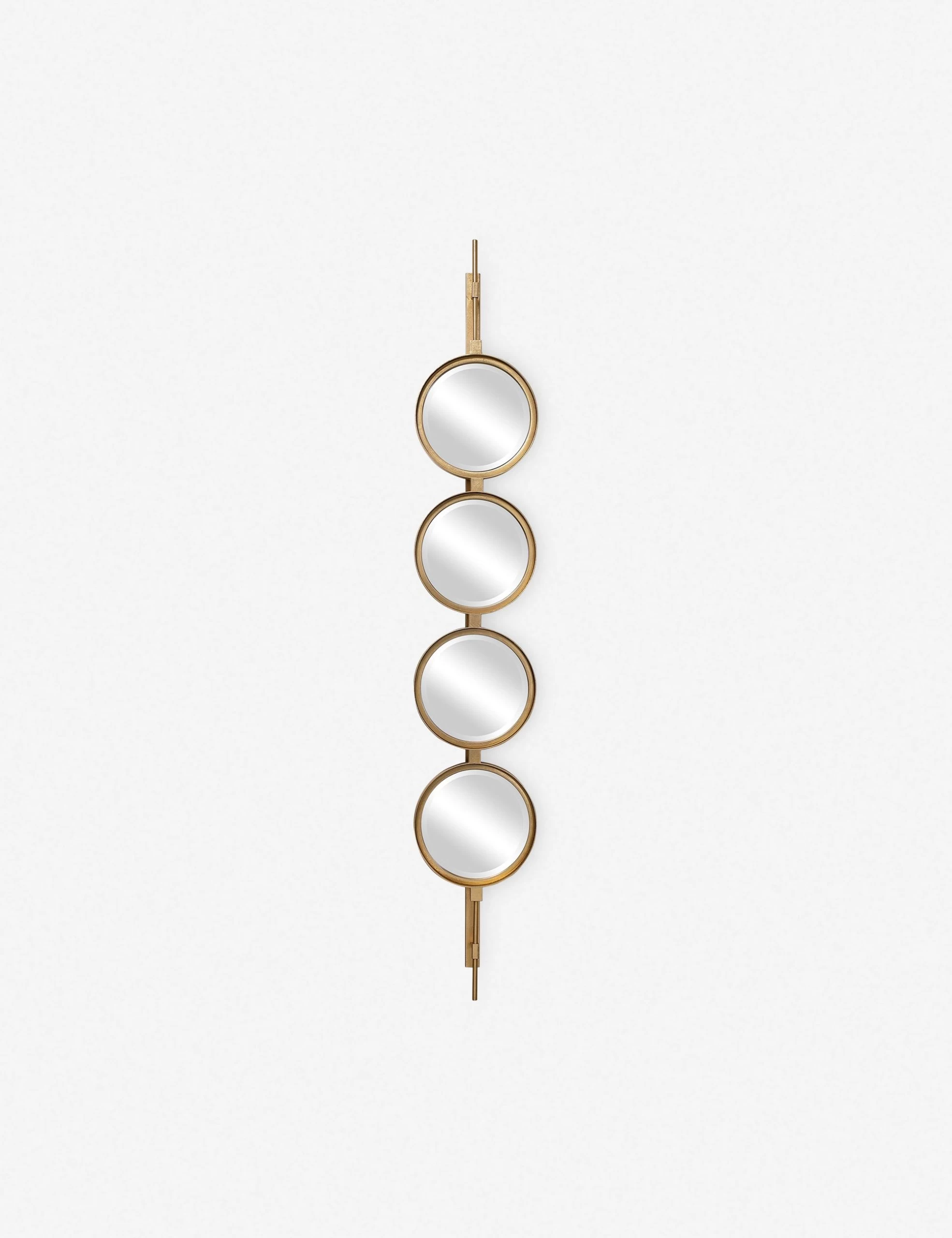 Four round beveled mirrors are set on a sleek iron base, creating a sense of balanced unity. Hang this decorative wall mirror vertically, horizontally, or in multiples to augment your wall decor with a unique and functional design feature.