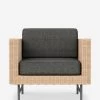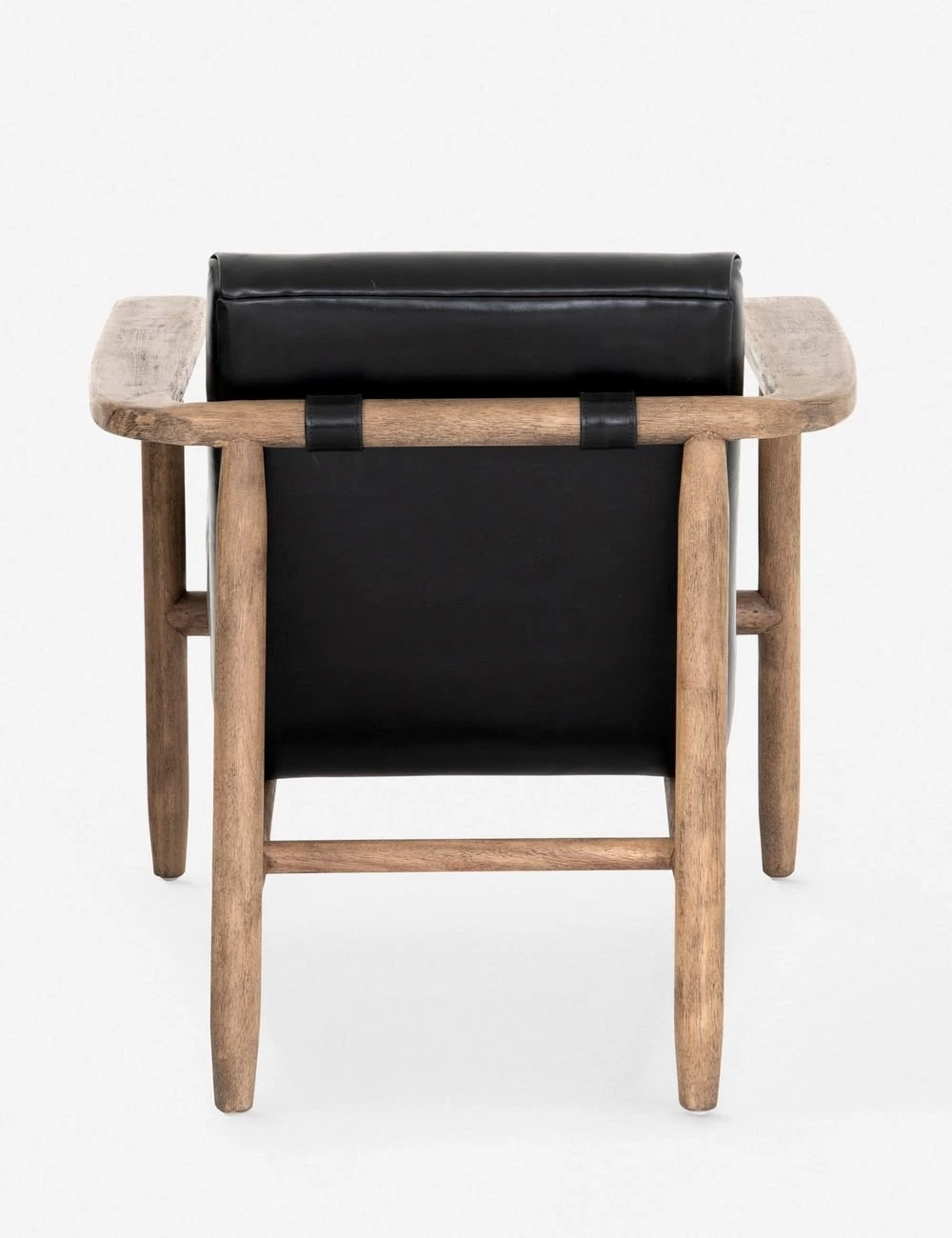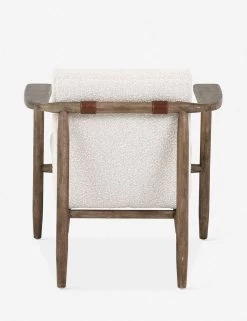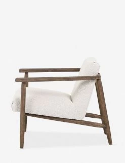 A mid-century modern chair that doesn’t take itself too seriously, featuring a low, angular profile. A distressed wood frame and dowel legs bring a touch of chalet-chic style to the look