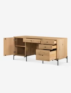 Pairing ultra-slim iron legs with a light-finished thick oak veneer, this modern desk offers mixed-material appeal in a streamlined silhouette. This desk provides ample storage in a clean, minimalist design featuring a spacious cabinet and four drawers.