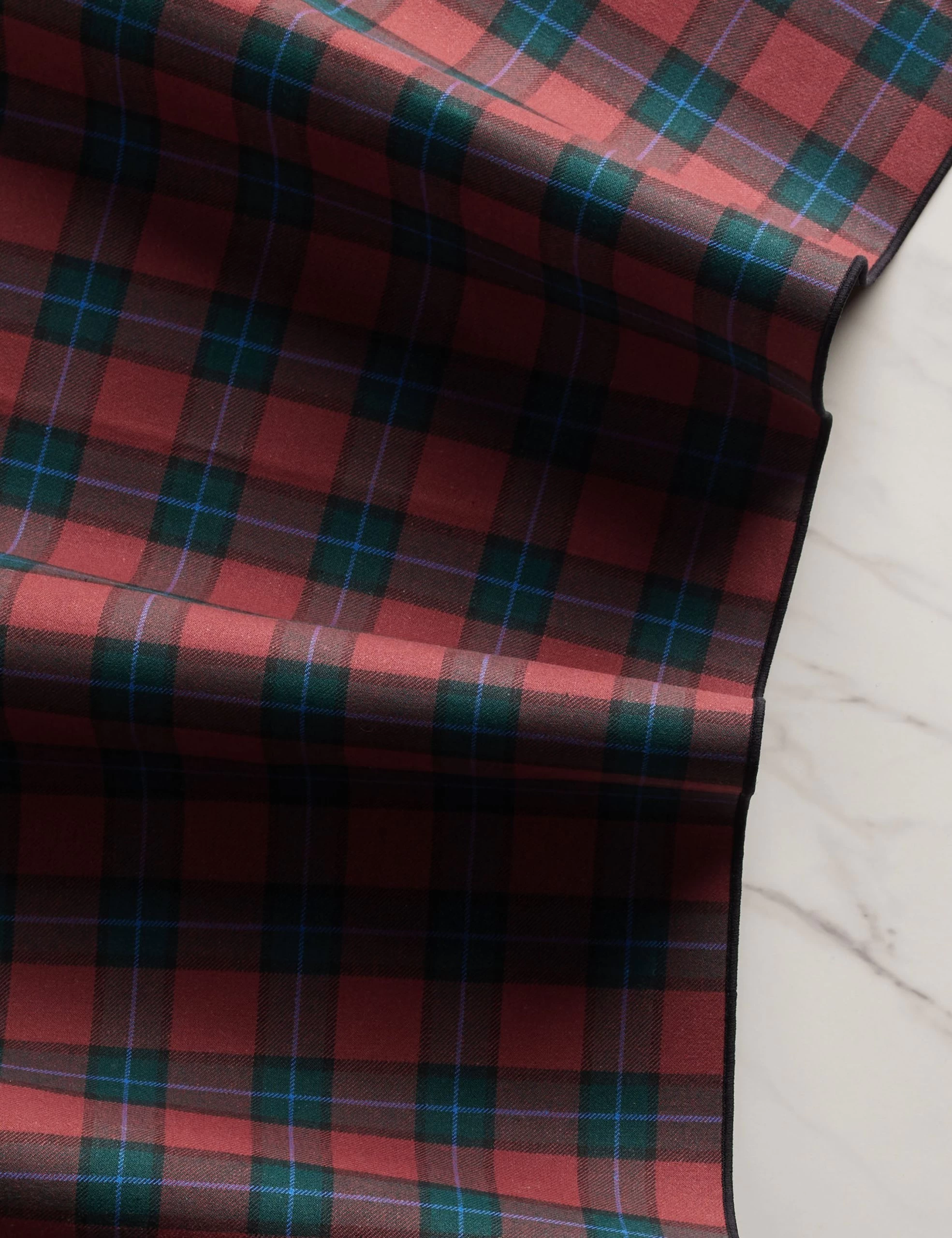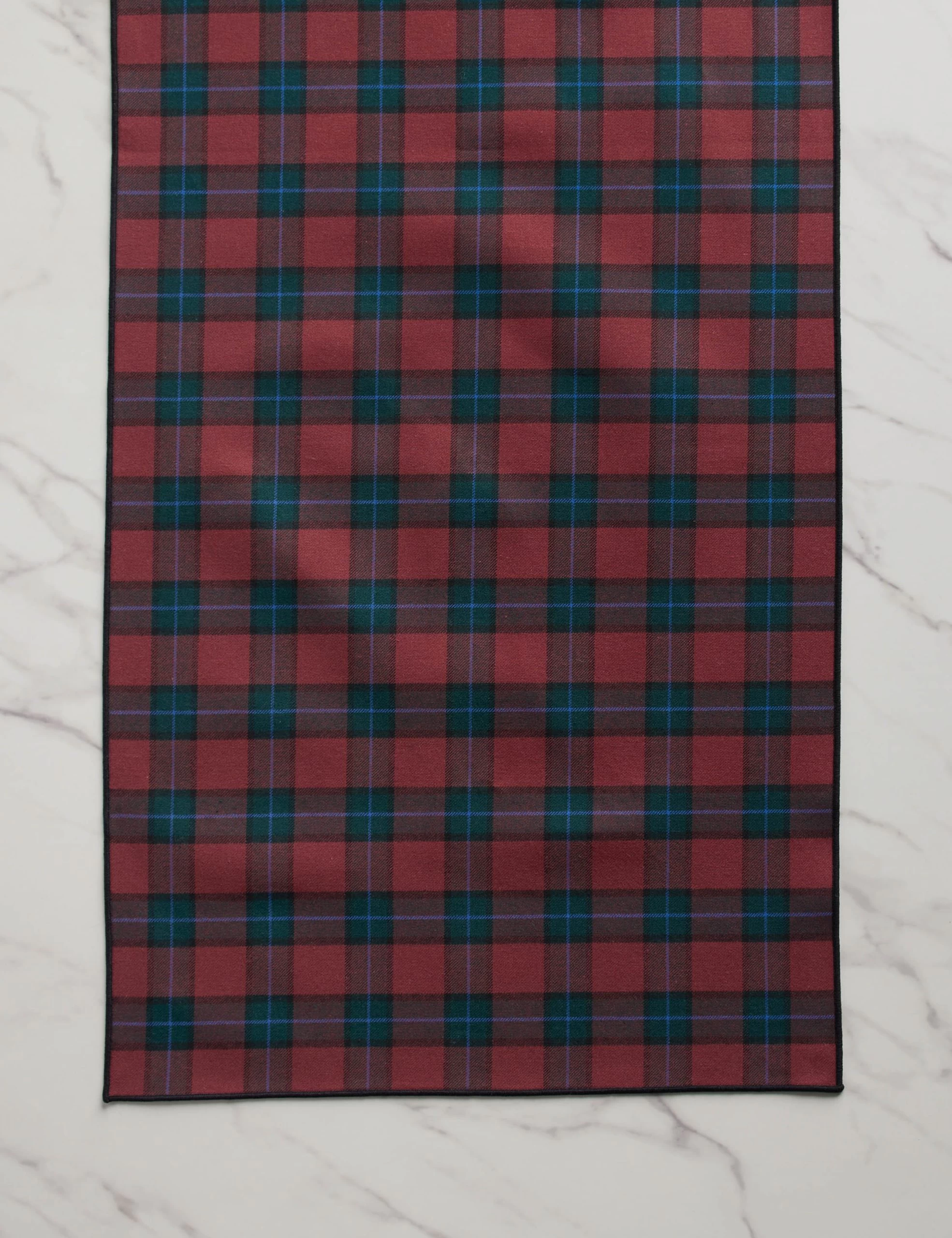 Atelier Saucier sets a modern table with sustainably made, high-quality linens in always-fresh styles. A regal plaid in burgundy and blue brings a timeless feel to this centerpiece runner. The smaller scale of this runner brings a warm ground to your tablescape while keeping the look chic and clean.