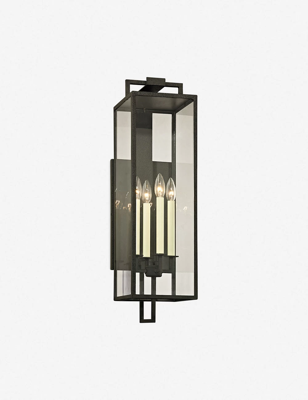Bring a timeless touch of elegance to your indoor or outdoor space with this metal wall sconce featuring modern lines, glass paneling, and classic candelabra bulbs. Framing your entryway, from inside or outside, is our favorite way to style this sconce.