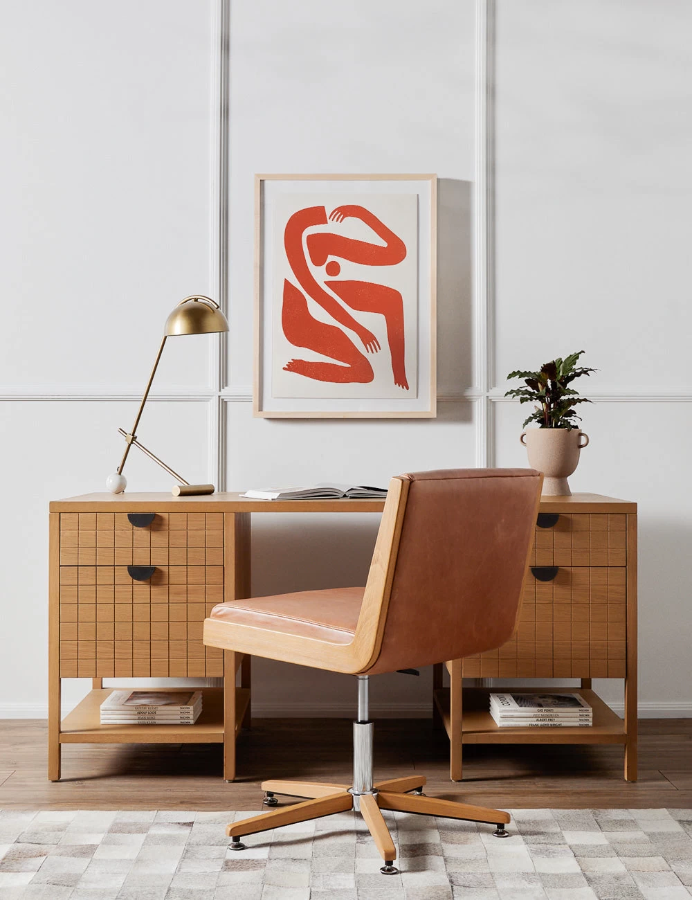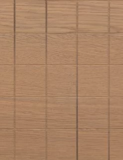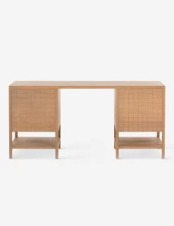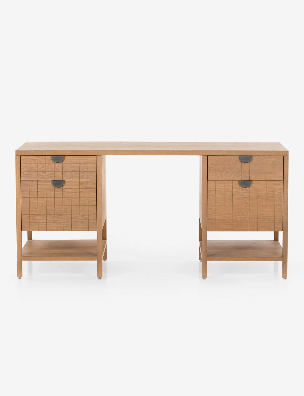 This burnished oak desk is finished with a geometric grid drawer fronts and half-moon hardware to offer up fresh retro undertones. The spacious drawers and open lower shelving provide easy storage in a clean, light wood desk design that is poised for style in your home office.