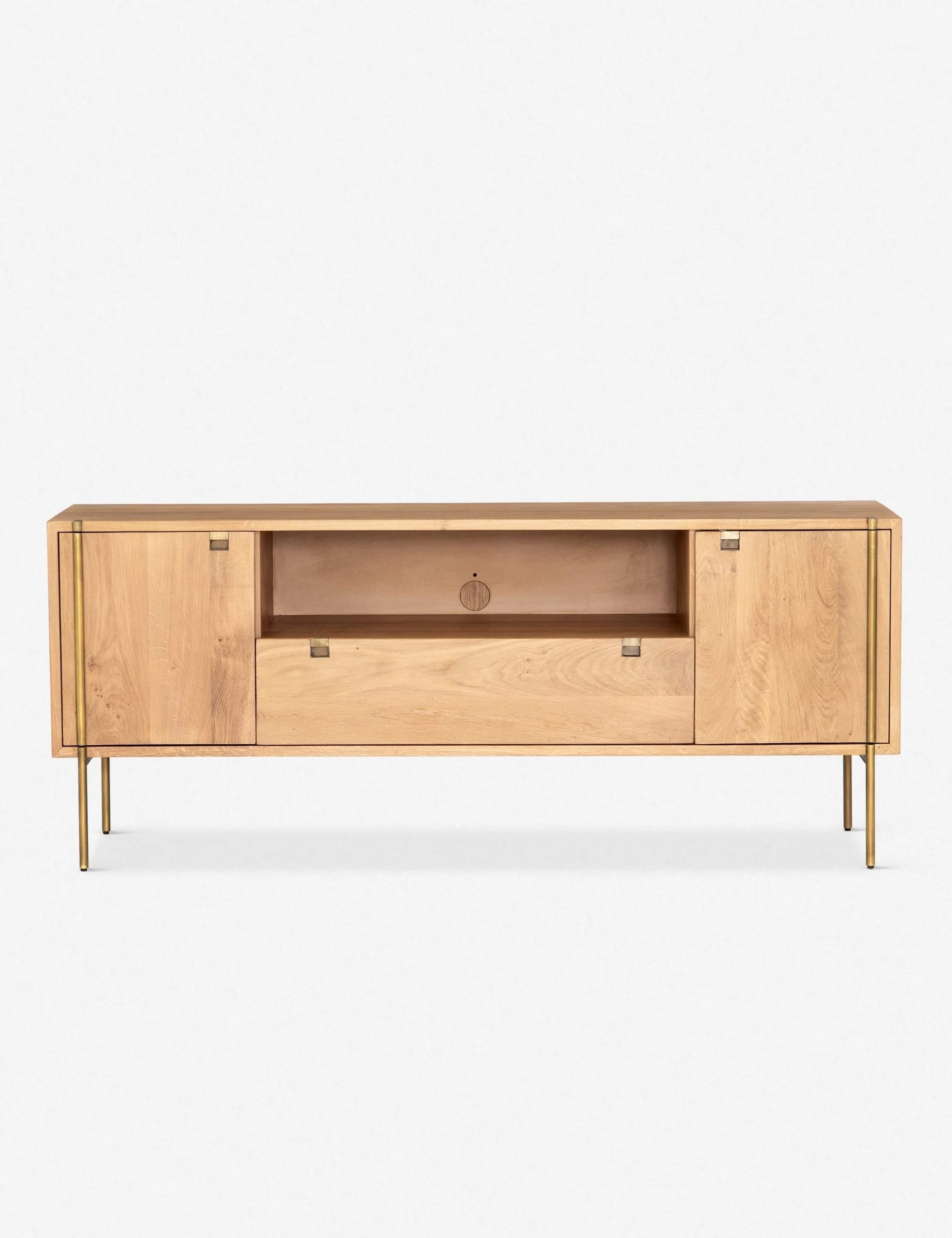 Combining streamlined design and retro details, the Karma collection is ideal for modern spaces. This media console features cutout details, natural oak variations and thin brass legs.