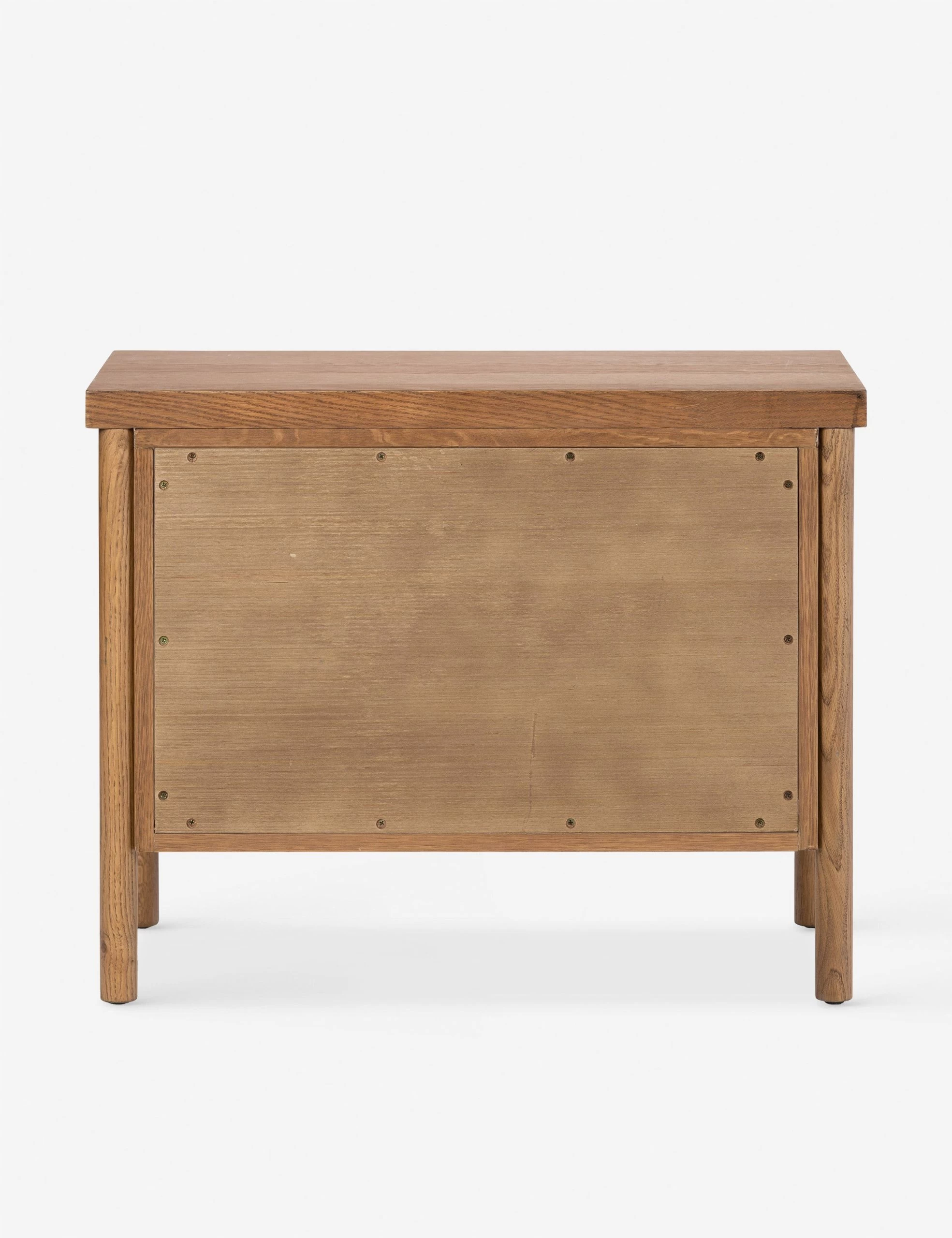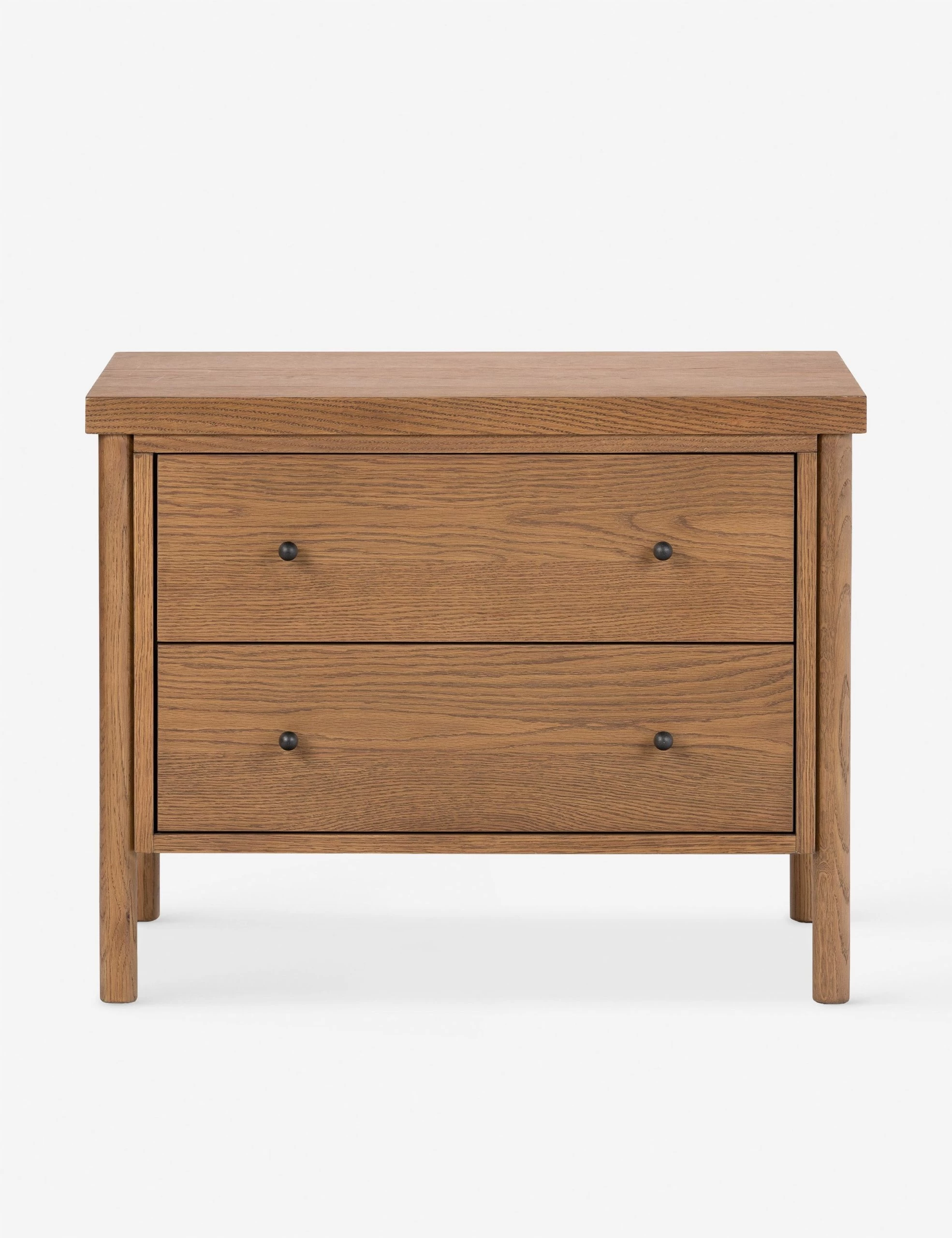 The Kisner nightstand brings transitional appeal to oak. Rounded legs hold a clean-lined frame in a warm finish that showcases the natural grain. Two spacious drawers bring ample storage to this modern nightstand.