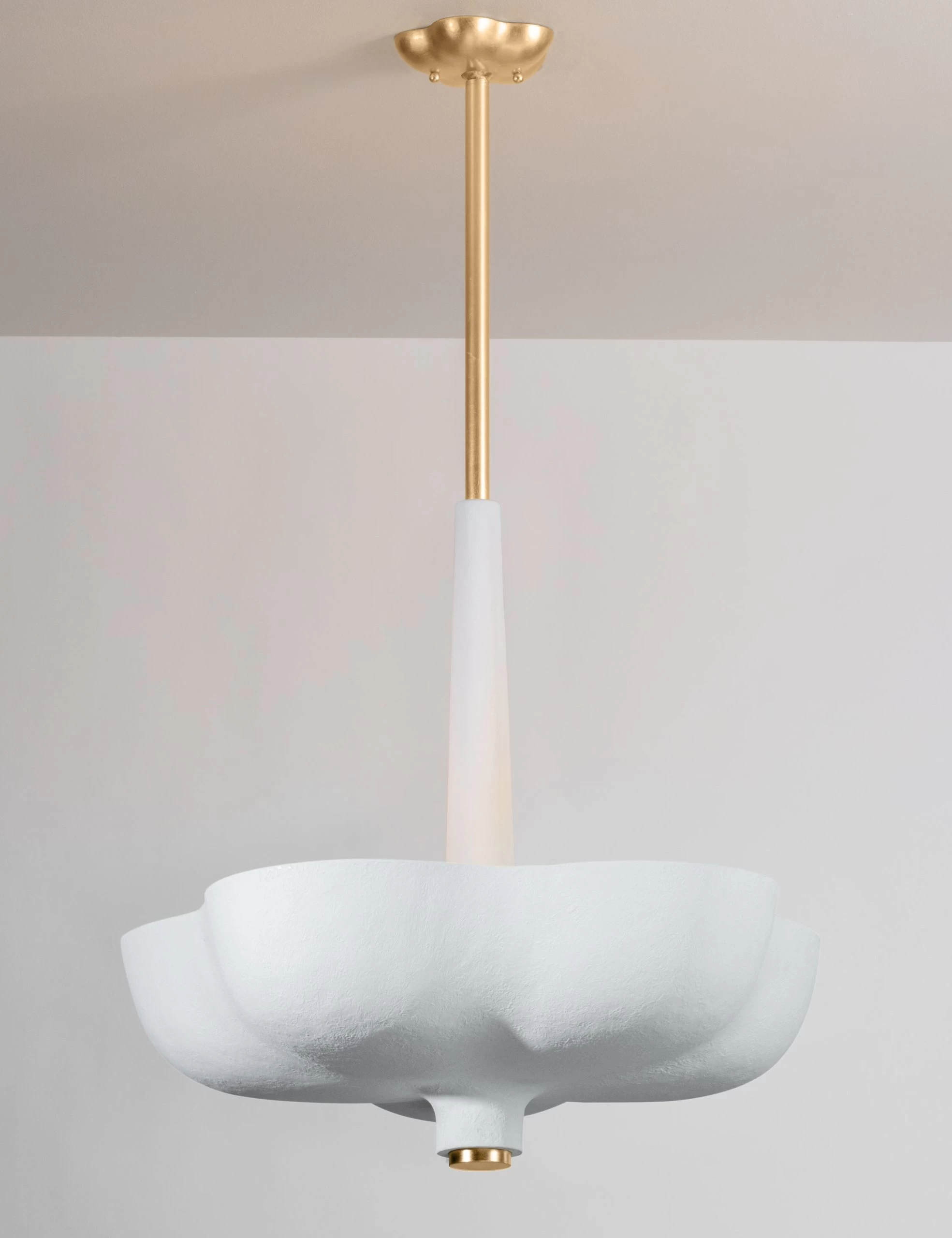 Nothing grounds modern decor like organic lighting. The Lacasa pendant is a study in soft elegance with its botanical form clad in a stark white gesso. Touches of gold leaf bring a polished finish to this stunning pendant light.