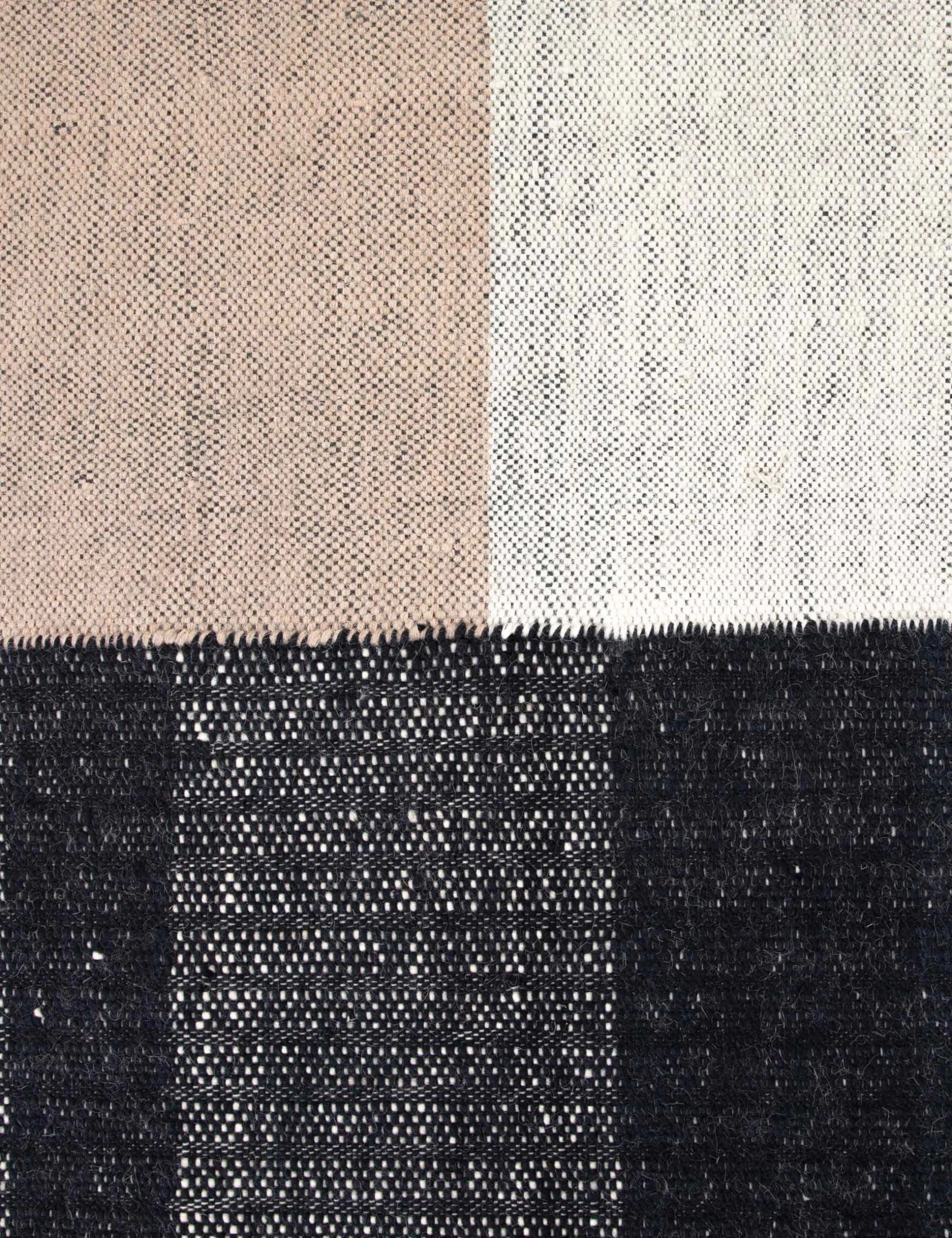 Abstract and asymmetrical design make this rug a modern favorite with a twist on traditional elements. The blocked pattern in tonal neutrals, accented with weft fringe, gives statement-making appeal that’s perfect as a living room area rug.