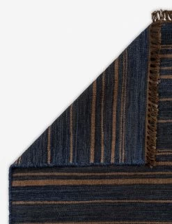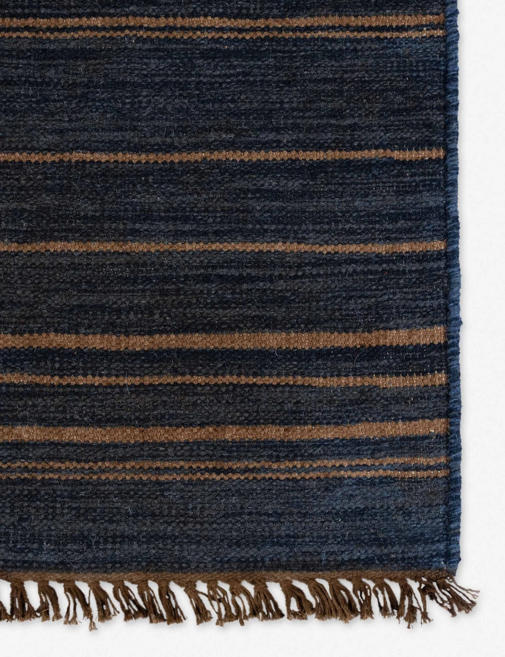 This handwoven area rug brings global inspiration to life with an asymmetrical stripe pattern and deep, rich hues. Knotted fringe and contrast stitching details make this living room rug a great piece for grounding your casual style.