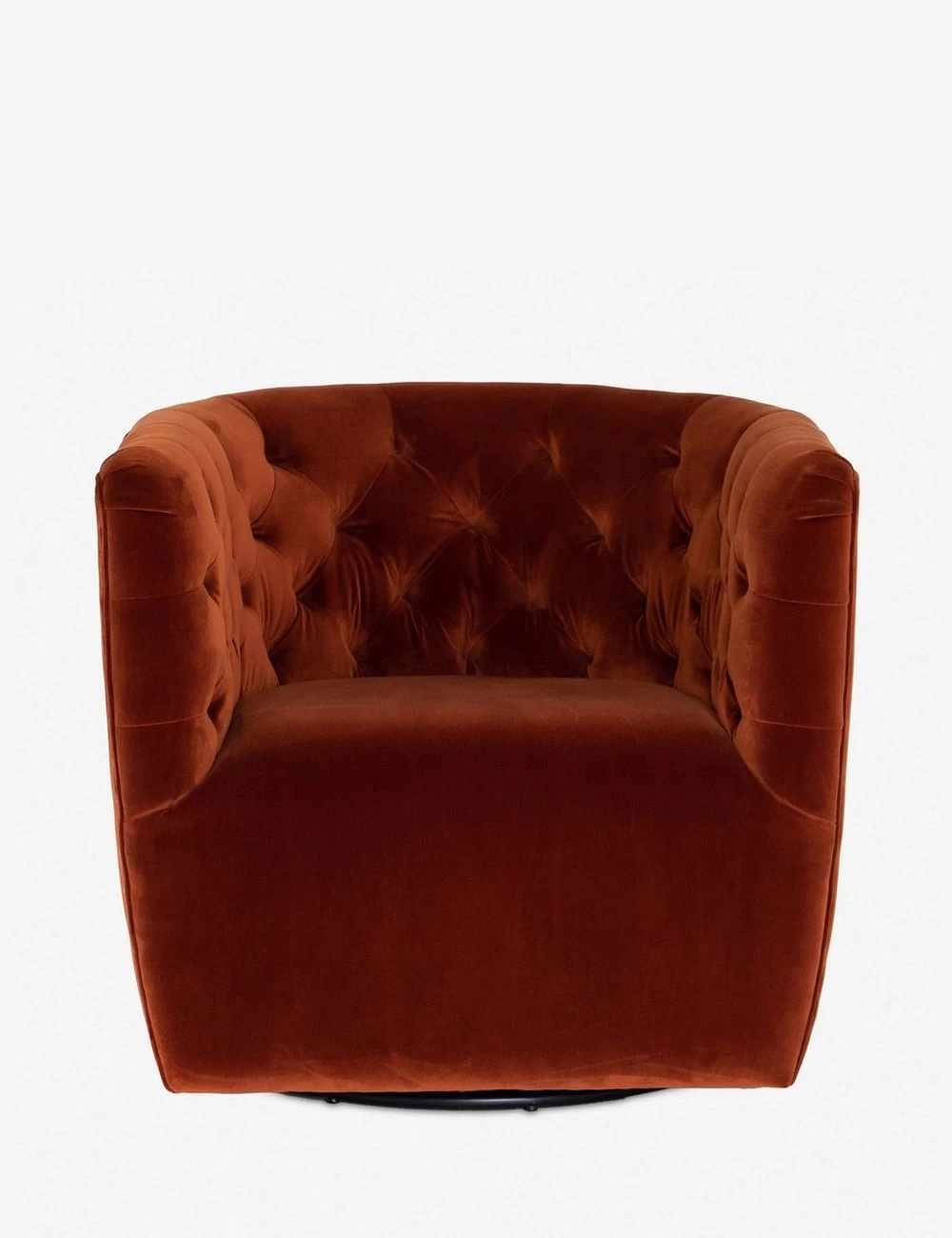 The traditional barrel chair gets a modern twist in this irresistibly stylish design. All-over upholstery and a tufted seat evoke a classic tone, while the shapely silhouette and swivel base fashion this accent chair with a chic edge. We love this piece for a cozy reading nook or timeless lounge.