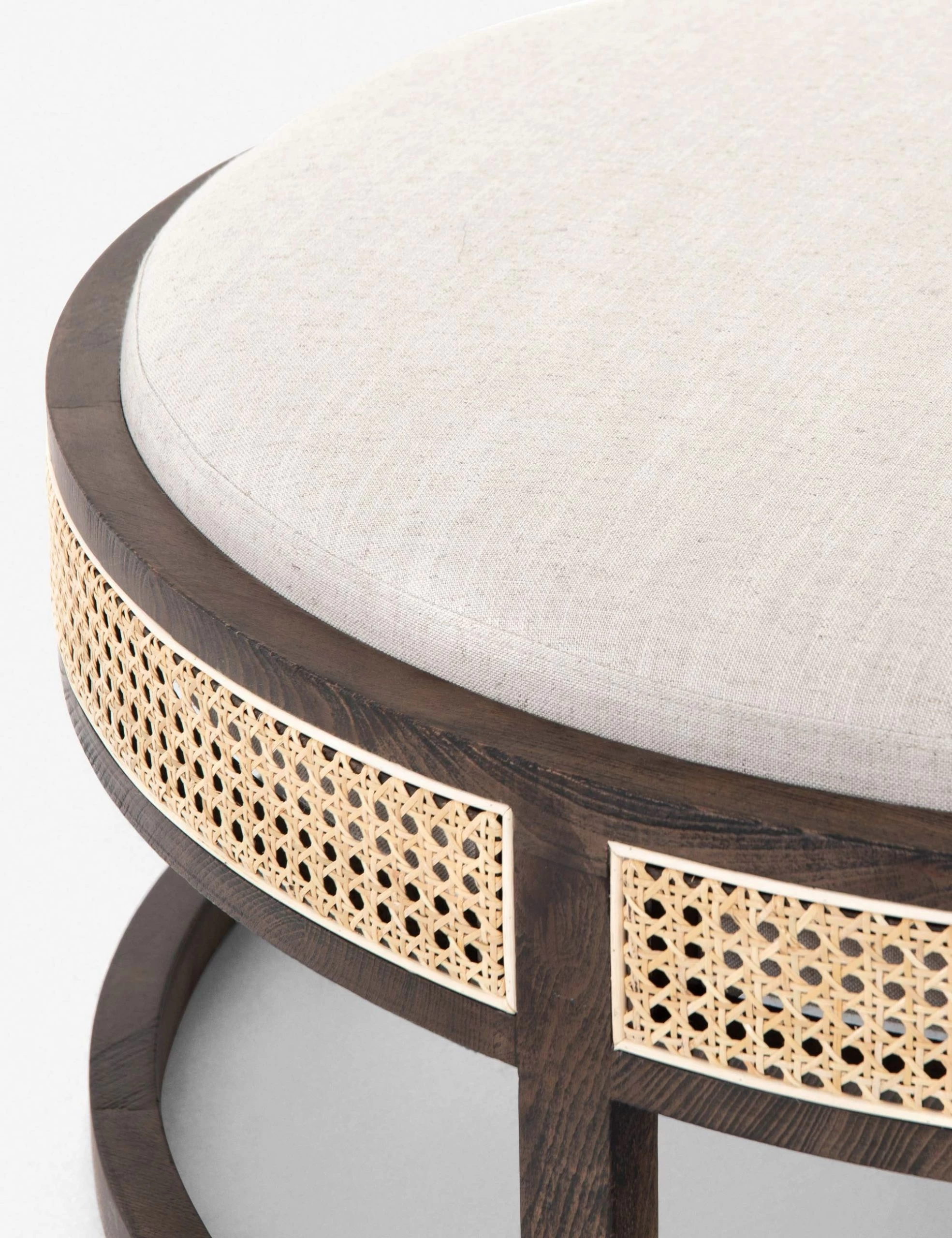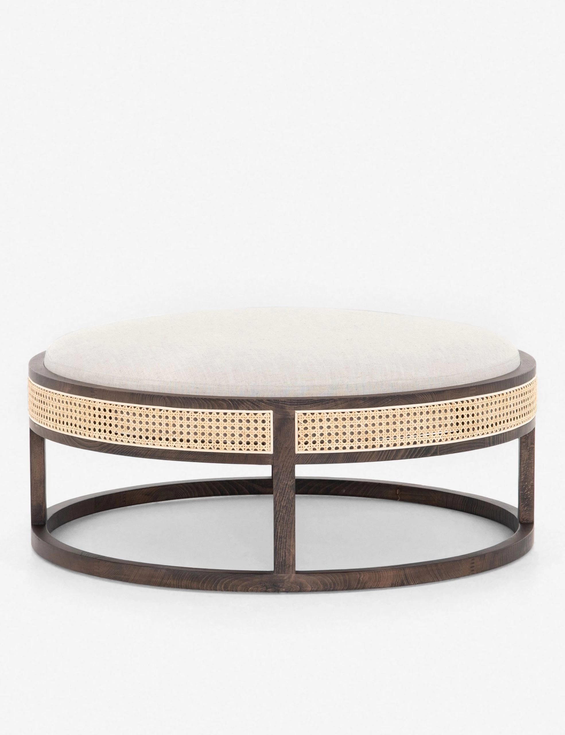 This wicker caned ottoman takes transitional style to the next level, topped with a fabric cushion. The contrasting tones and open frame add visual interest, making this large round footrest a key addition to your living room setup.