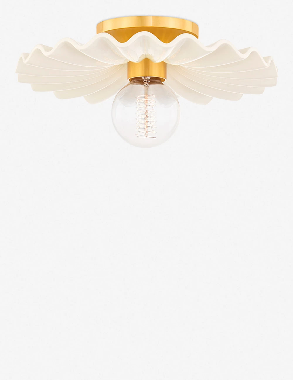 Refresh your lighting design with the delicate yet dynamic silhouette of the Madrona sconce. The ruffled form of the shade catches the light, offering sculptural contrast against the clean lines and polished luster of the antique brass finished fixture. Style this sconce light alone or in multiples for a stunning statement.
