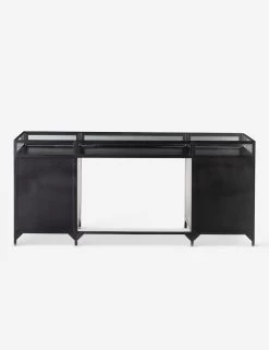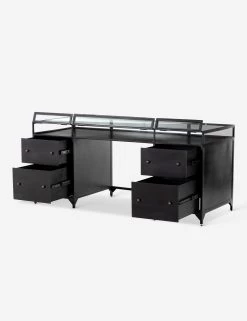 In a sleek nod to a shadow box design, this desk features an iron frame with glass enclosures for storage and display. The Malcom Executive Desk includes file drawers finished and brass knobs to offer a practical touch with an industrial edge.