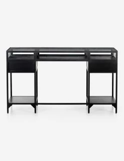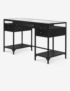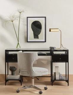In a sleek nod to a shadow box design, this desk features an iron frame with glass enclosures for storage and display. The Malcom Modular Desk is finished with brass knobs in an airy, streamlined design to offer a practical touch with an industrial edge.