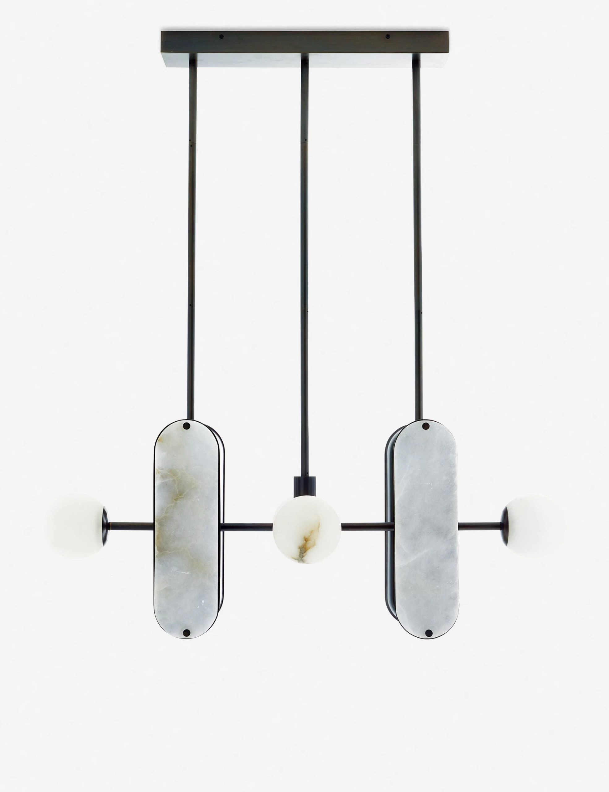 The Maradona pendant light pairs globe shades with alabaster panels to offer a beautiful transitional design that will fill your space with soft, diffused light. This linear pendant is the perfect touch over a kitchen island or dining table.