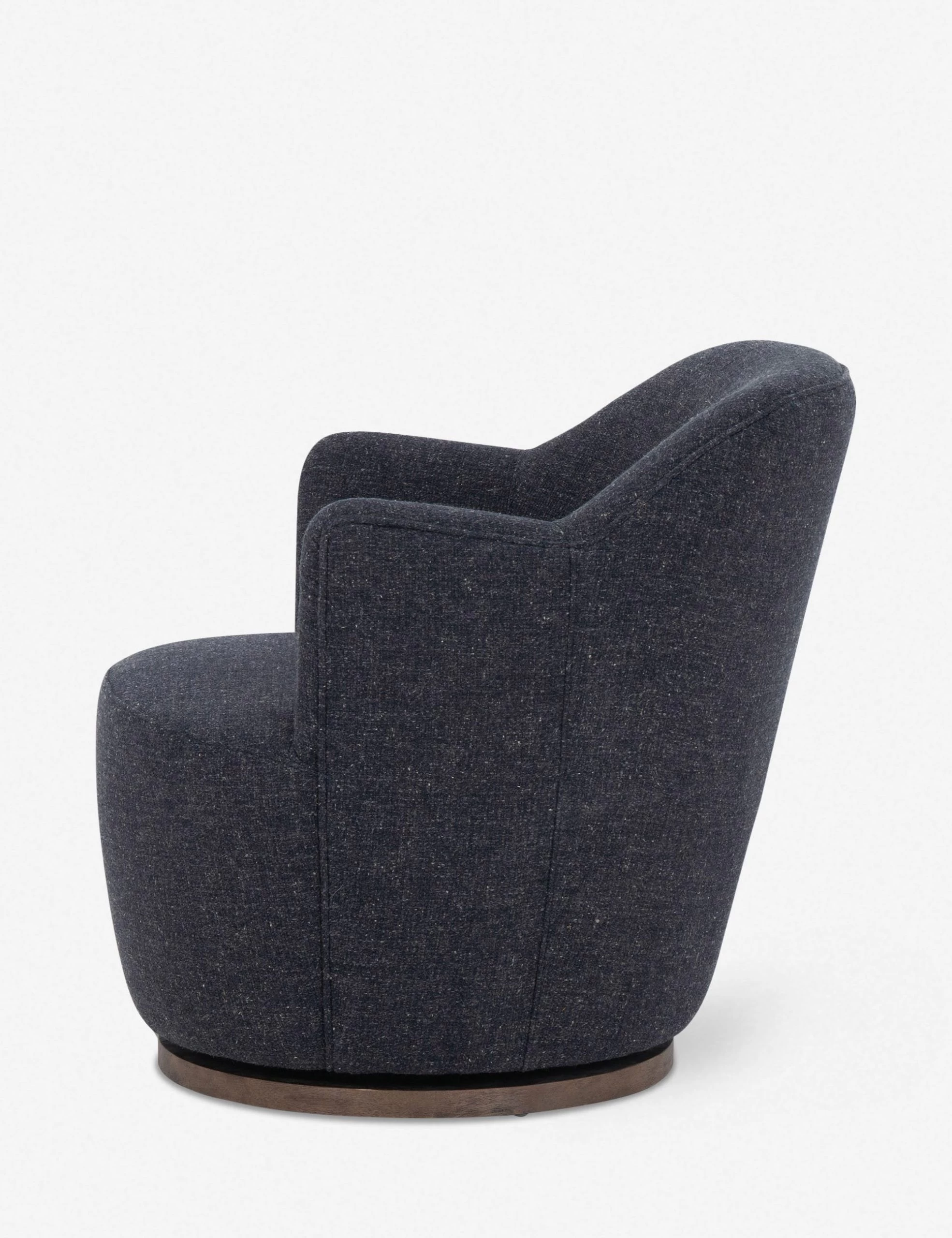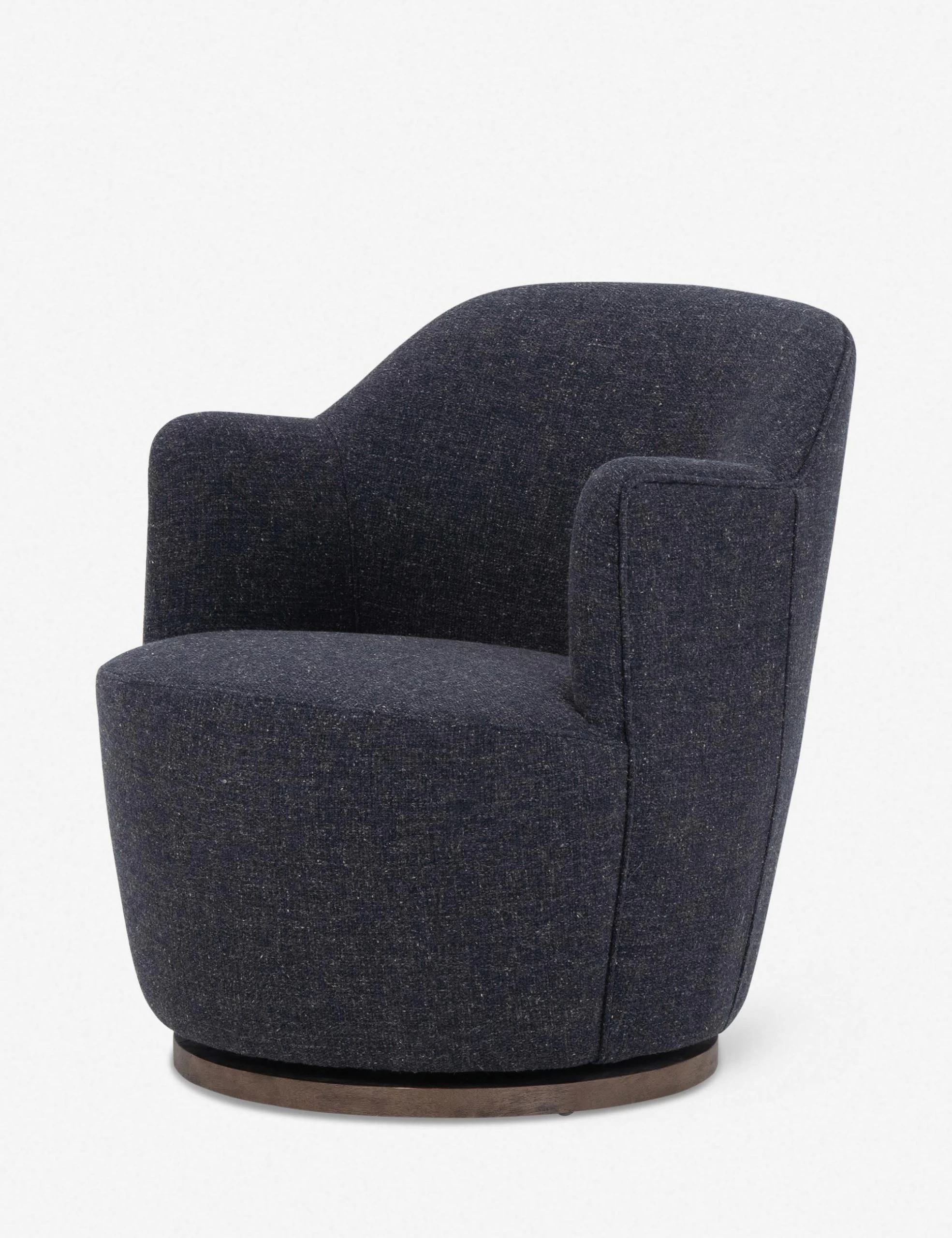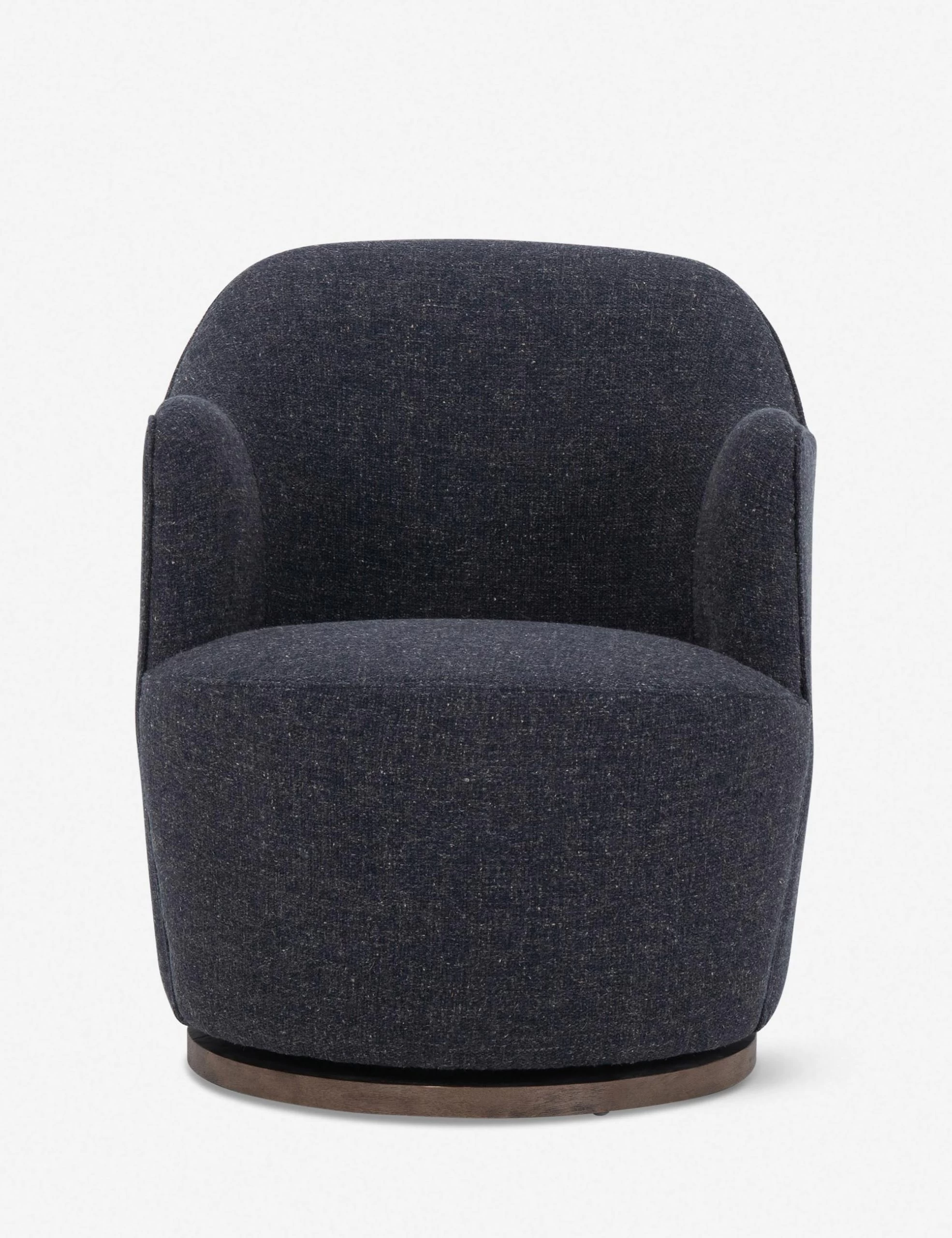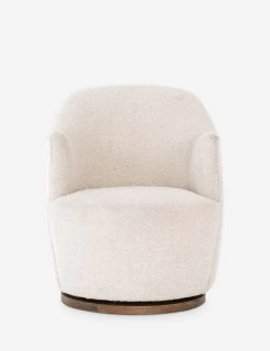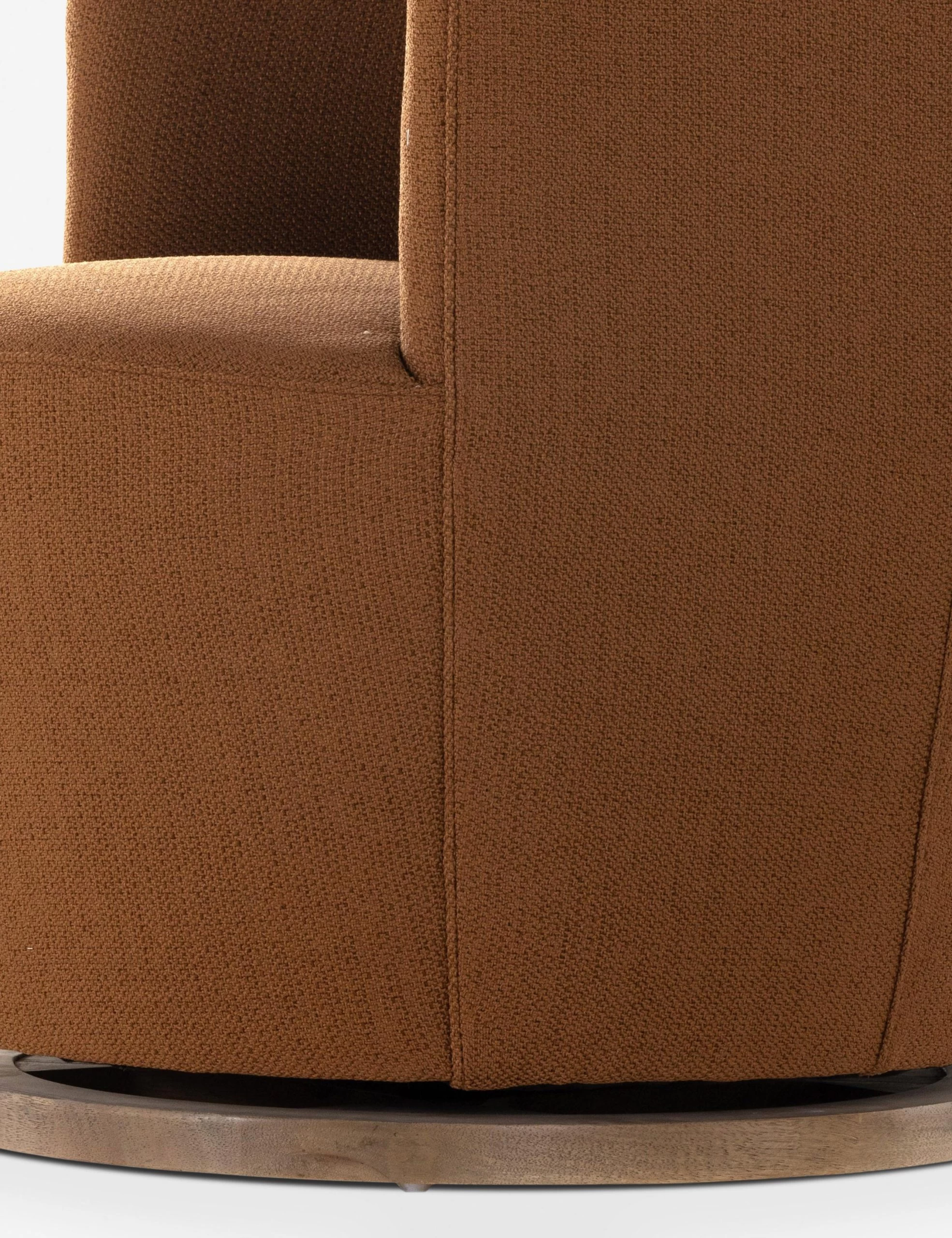 Nubby fabric on the Margie Swivel chair creates an invitation to cozy up and sit. A circular shape makes for a unique piece, and a wooden swivel base allows for conversation in any part of the room.