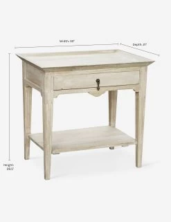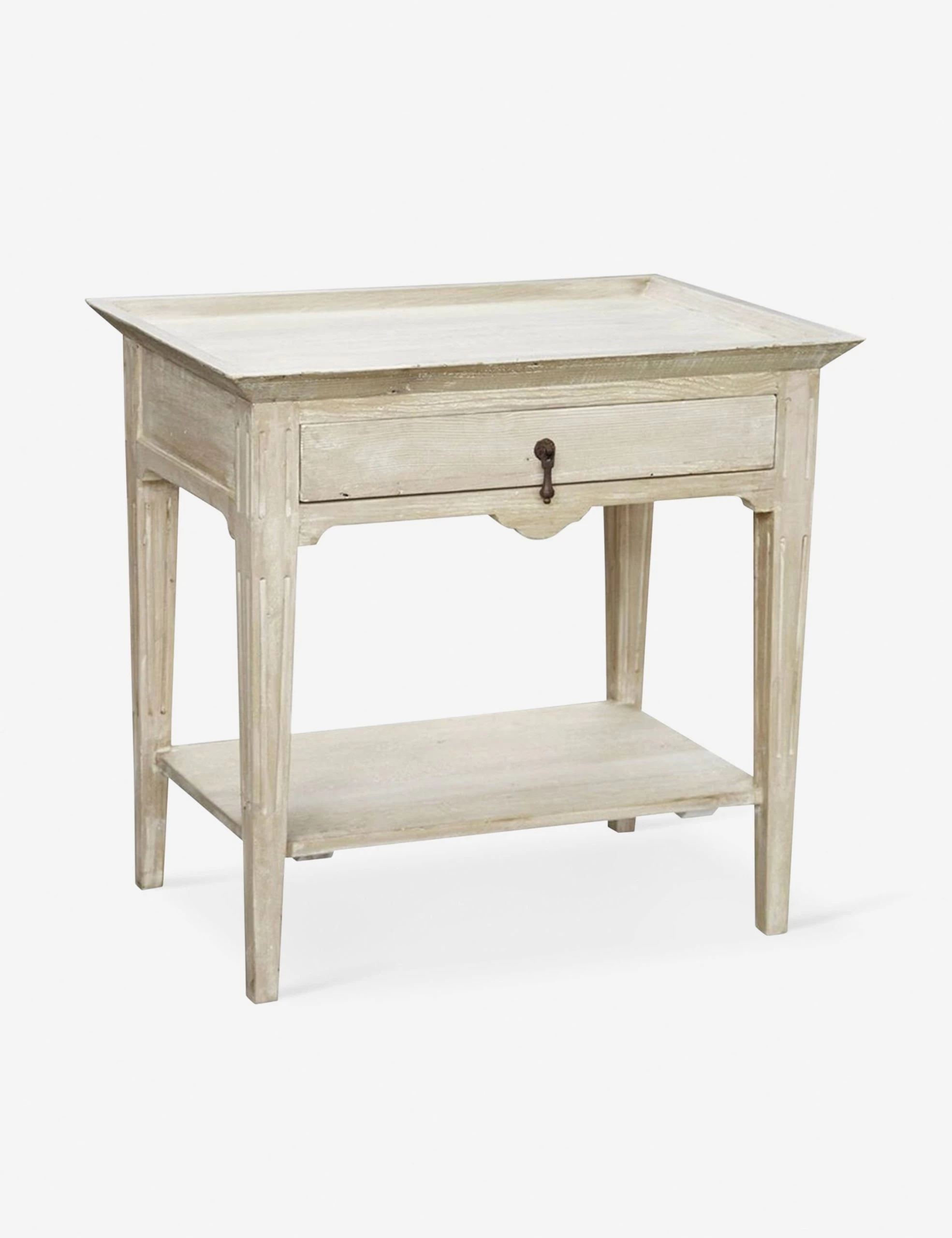 Intricate carving and delicately tapered legs lend this nightstand a glamorous and feminine air. The light washed wood and teardrop drawer pull have plenty of antique charm, and the lower shelf provides plenty of extra storage.