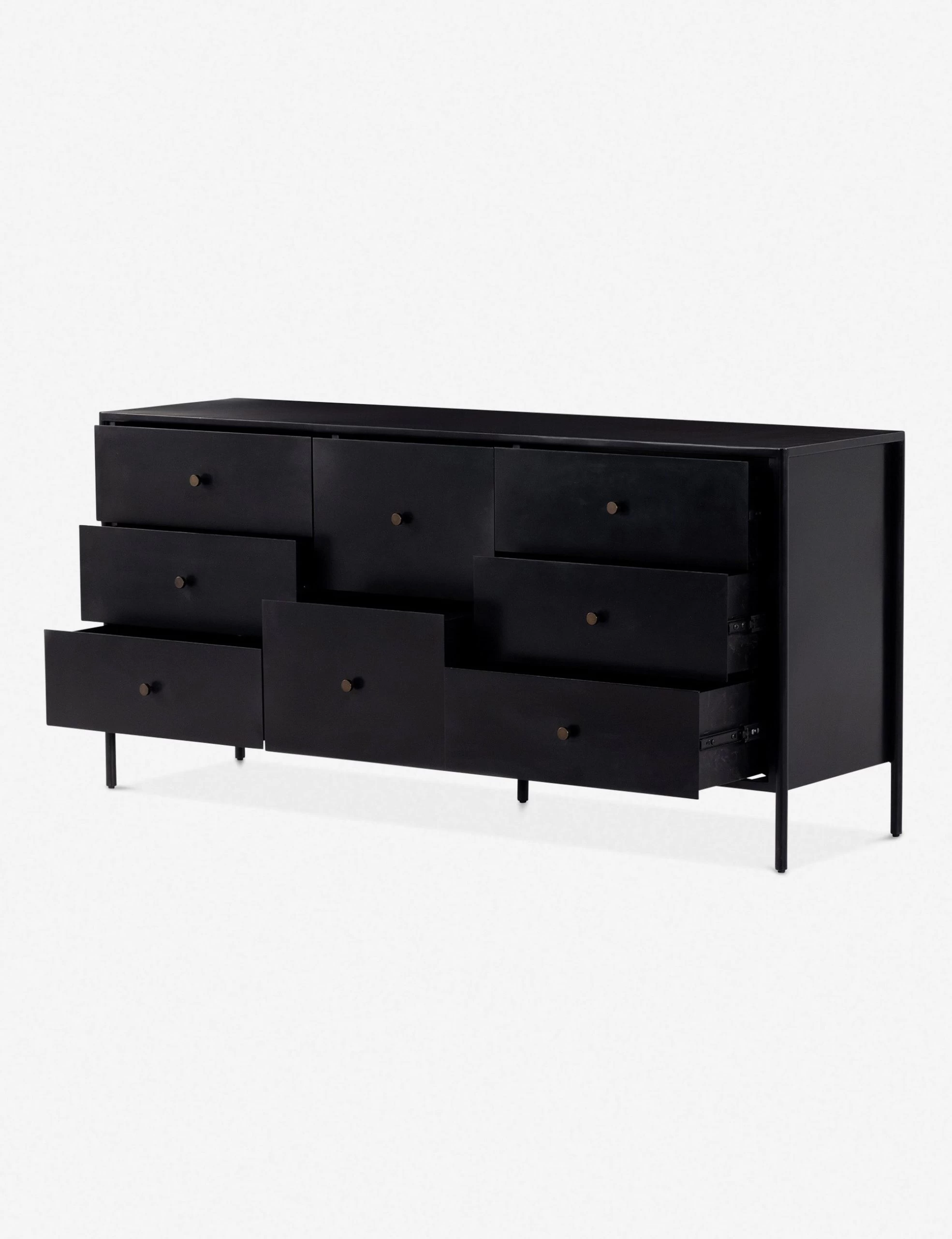 Black-finished iron set in a refined profile and fitted with bronzed iron hardware to evoke a clean, polished industrial look with stunning visual impact. This luxe eight-drawer dresser offers functional bliss with its spacious storage capacity.