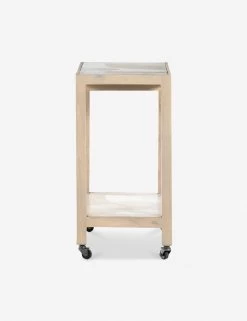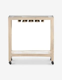 This wheeled bar cart brings a luxe touch to a lounge or open-plan space. The light-finished mango wood frame features white marble shelves with inlaid shapes for stylish intrigue. The tonal appeal of this cart looks stunning decked out in your favorite cocktail and barware essentials.