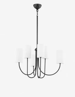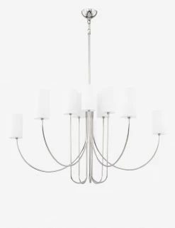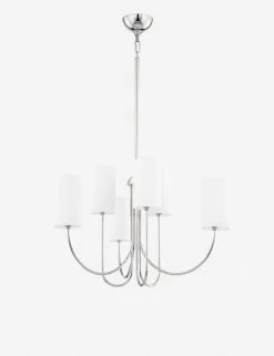Slender, sweeping lines bring a modern elegance to this chandelier design. Topped with crisp linen shades, this chandelier pendant is poised to become a signature feature with transitional appeal in your home, in the entryway, dining room, or living space.