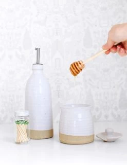 Vermont-based studio Farmhouse Pottery creates handcrafted accents and table essentials with rustic charm. This handy oil bottle is wheel thrown, dip glazed, and features a stainless steel dispenser to create a durable, versatile piece that can sit on your counter or dining table.