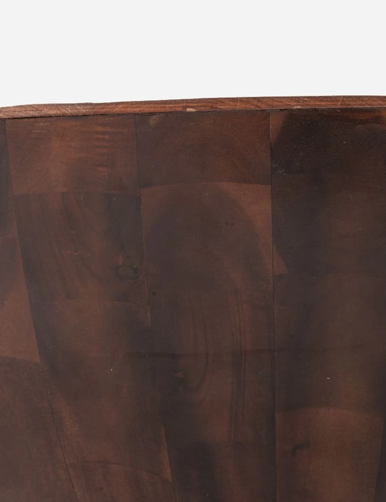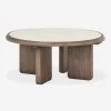 A beautiful wood coffee table makes a perfect centerpiece for any living room. This piece has a unique half-circle shape, creating an inviting spot to gather around.